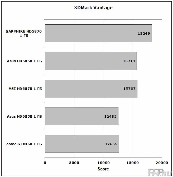 Более свежая версия 3DMark Vantage, показывает более существенную разницу между видеоадаптерами, хотя распределение мест осталось прежним.