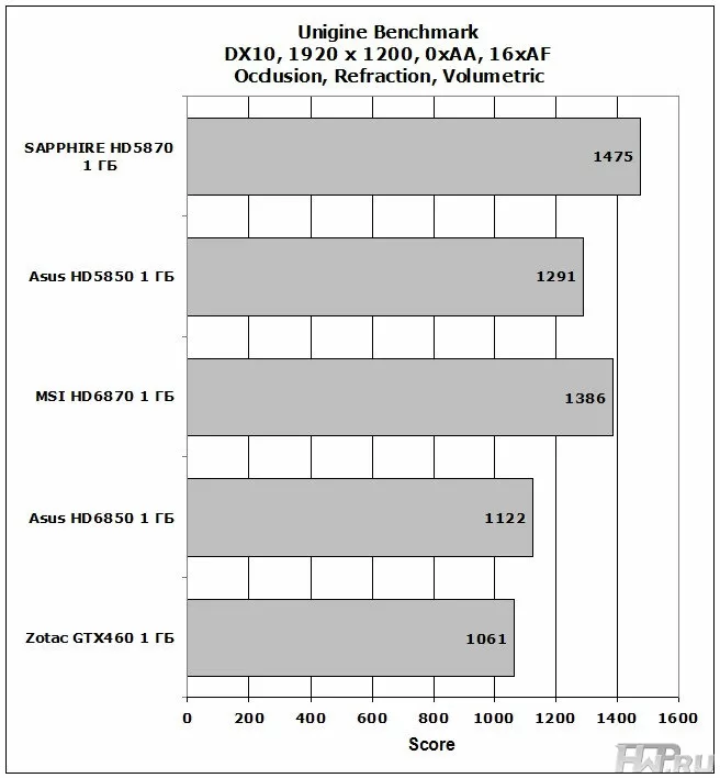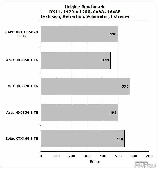 Unigine Benchmark показывает интересные результаты. На DX10 мы видим превосходство ASUS HD6850 DirectCU над GTX460, но EAH5850 и HD5870 опережают их обоих.