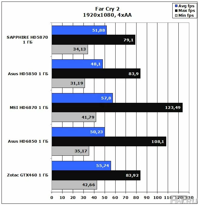 Видеокарта ASUS HD6850 DirectCU отлично показала себя в игровом бенчмарке Far Cry 2, среднее значение FPS находится аккурат между HD5850 и HD5870. Правда, все три видеокарты проиграли GTX460, но пальма первенства принадлежит HD6870.