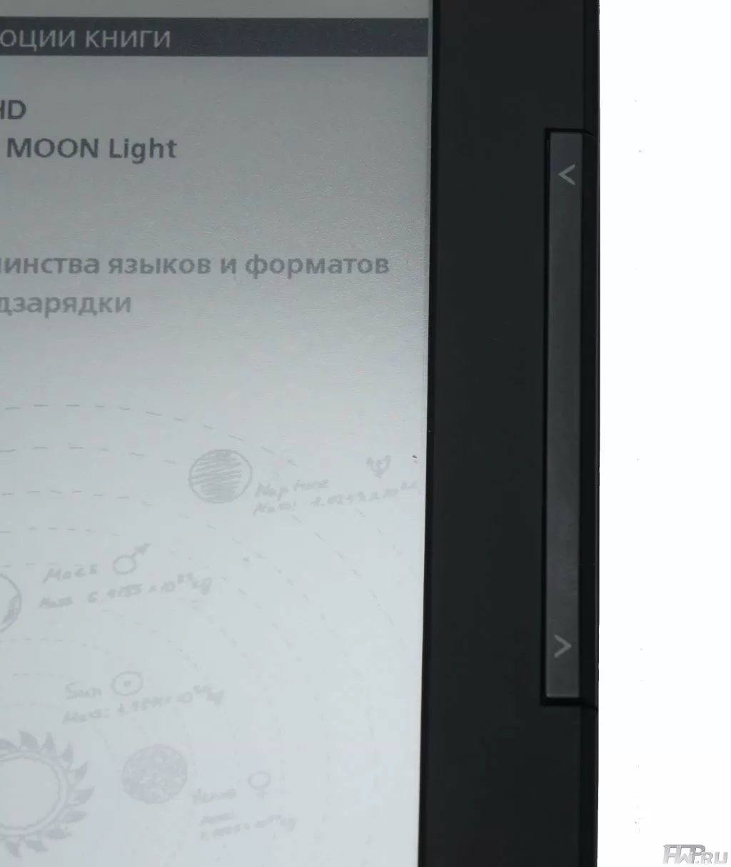 Спереди располагается дисплей E-Ink Pearl HD с разрешением 1024х758 точек и диагональю шесть дюймов. Его параметры типичны: 16 оттенков серого, контрастность 12:1. Присутствует фирменная встроенная подсветка, именуемая Moon Light.