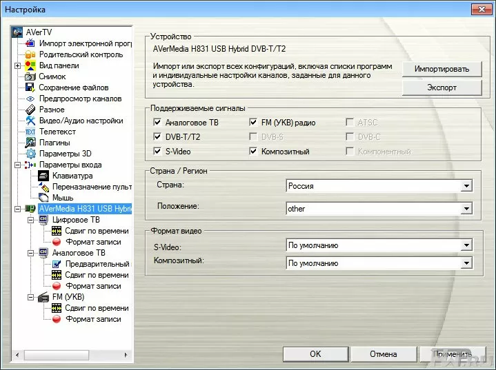 В настройках AVerTV 3D можно посмотреть совместимые режимы работы, для AVerTV Hybrid Volar T2 это: аналоговое, цифровое ТВ, FM-радио, S-Video, а также композитный видеовходы.