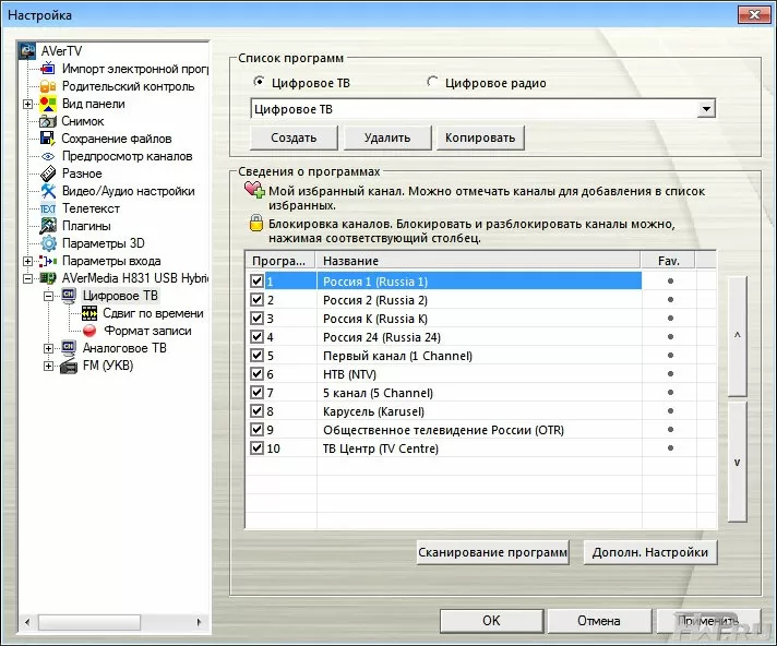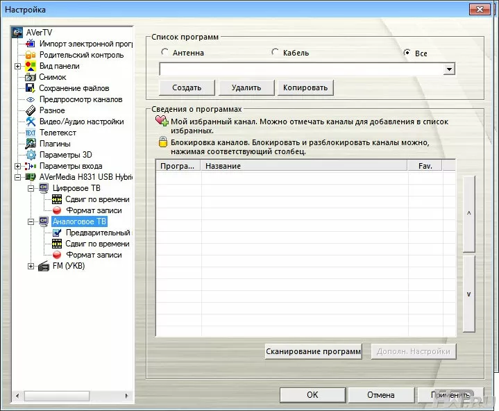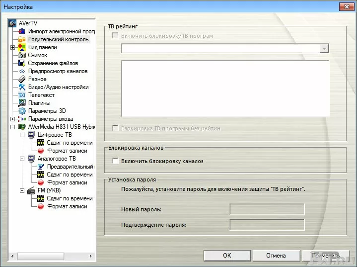 Теперь пройдёмся по интересным общим настройкам. AVerTV 3D поддерживает защиту "ТВ рейтинг", то есть блокировку каналов с помощью пароля.