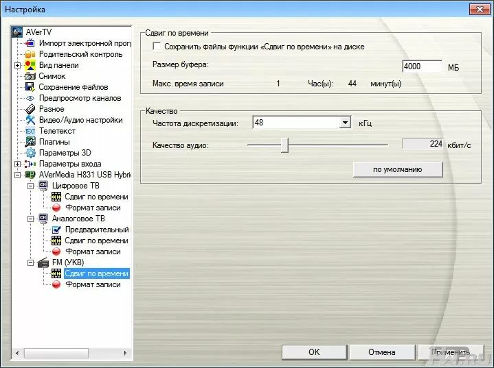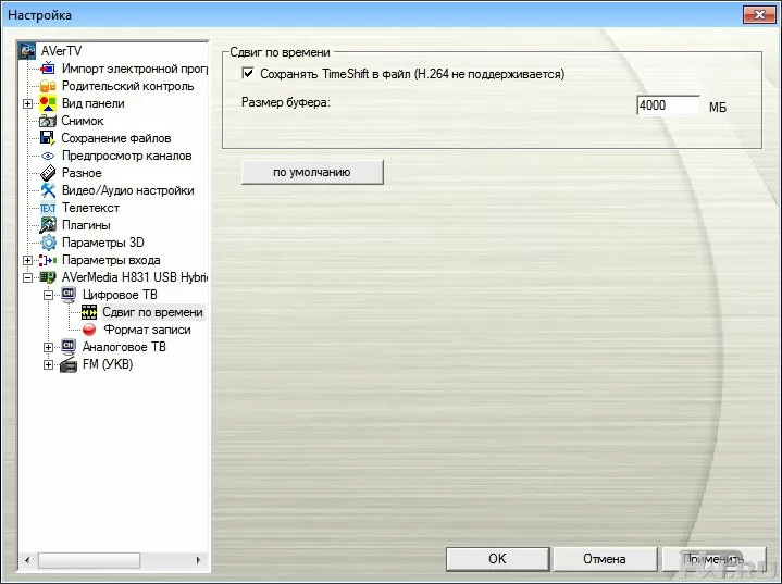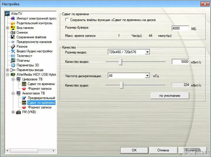 Аналогичный перечень настроек и у аналогового ТВ. Тут также поддерживается сдвиг по времени, и также можно выбрать формат видеозаписи.