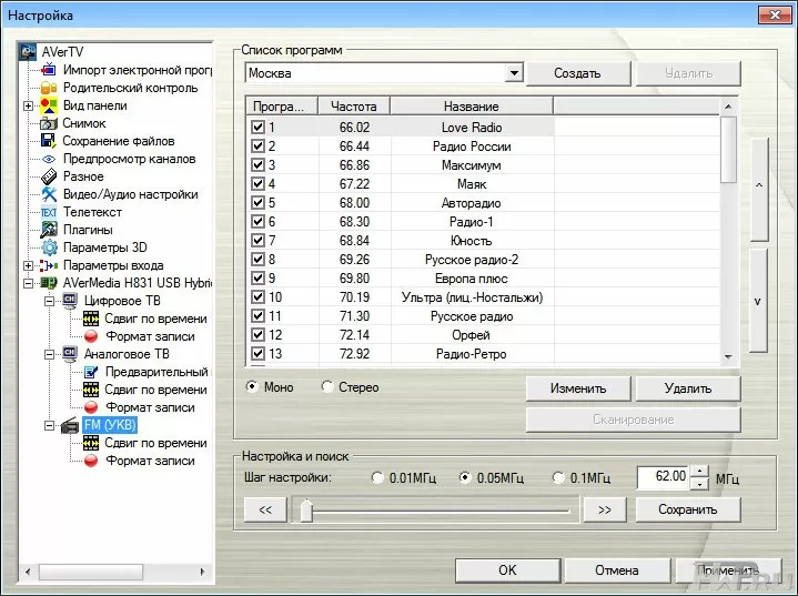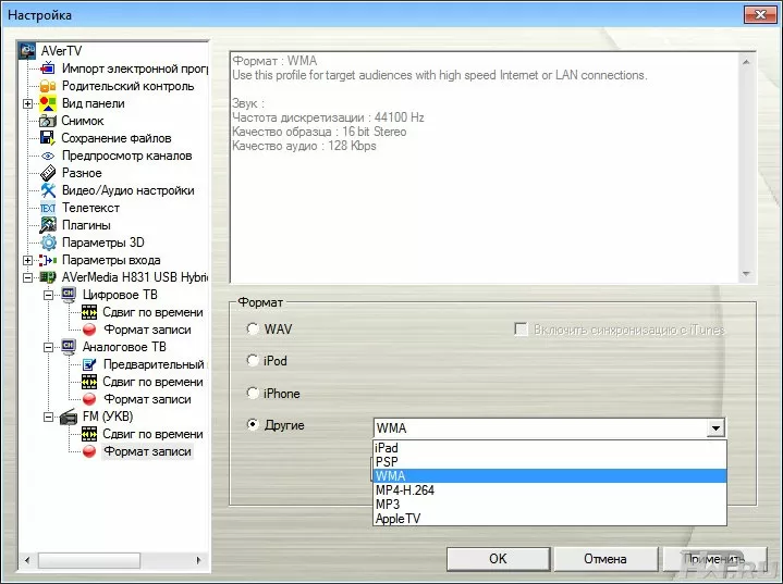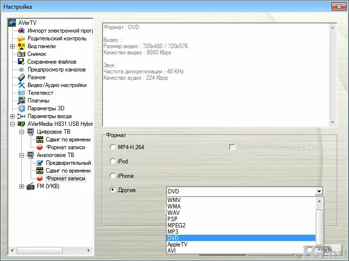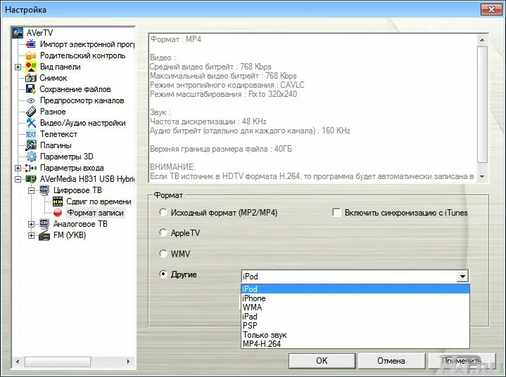 Стоит ли говорить, что AVerTV поддерживает множество форматов, в том числе и позволяет сохранять видео в формате для просмотра материала на устройствах Apple, PSP.