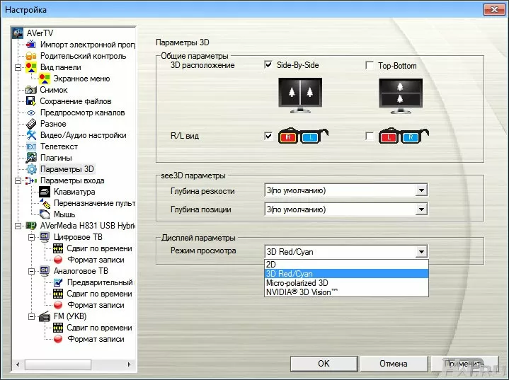 Наконец мы добрались до самой интересной возможности нового программного обеспечения, а именно поддержке 3D (как и следует из названия). AVerTV 3D поддерживает все популярные технологии: анаглиф, поляризационные очки, а также затворные очки NVidia Vision. Стоит ли говорить, что нагрузка на систему при использовании 3D значительно вырастает, хотя любой современный ноутбук справится с ней без труда.