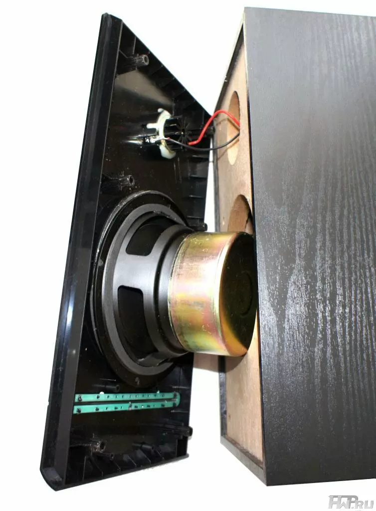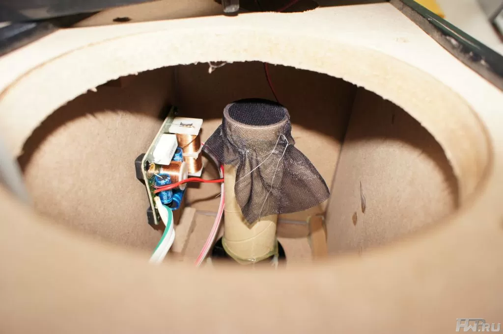 Заглянув внутрь можно увидеть прекрасную картину - во-первых, фазоинвертор заботливо защищен тканью. Зачем - очень хорошо знают родители маленьких детей. Остальные, я думаю, уже догадались. Также на фото выше можно разглядеть пассивный кроссовер, который нужен для согласования АЧХ динамиков. Если не вдаваться в технические тонкости, то скажем коротко - судя по элементам кроссовера, выполнен он очень достойно.
