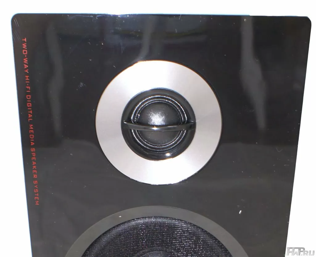 Пищалка открыта, но для сохранности имеет защитную дугу - привычное решение. Обрамляет её большая серебряная вставка, как бы привлекая на ВЧ динамик внимание. А тут действительно есть на что посмотреть - твиттер купольный тканевый, мощностью 20 Вт, сопротивление 6 Ом.