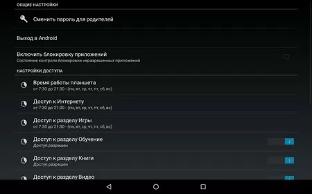 Коротко же отметим его достоинства – меню очень красочное, с крупными иконками. На планшете уже предустановлено два десятка различных игр и обучающих приложений, все приложения – лицензионные и их стоимость составляет более 3 тысяч рублей. Также из достоинств отметим родительский контроль, с помощью которого можно не только редактировать списки приложений, поставить пароль на выход в стандартную оболочку Android, но и выставить временные промежутки, в которые можно пользоваться планшетом и запускать игры, видео и т.д.