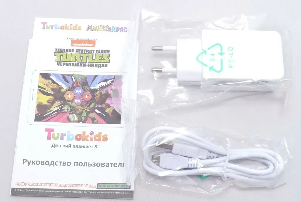 Комплектация небогатая – помимо самого планшет с предустановленной защитной плёнкой на экране и бампером, в коробке можно найти кабель microUSB и сетевое зарядное устройство.