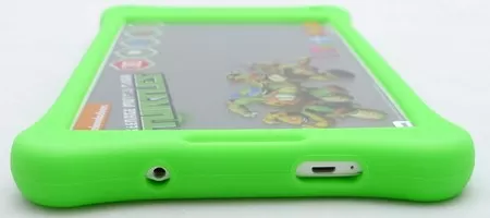Прямо из коробки планшет TurboKids Черепашки-ниндзя извлекается с предварительно надетым защитным резиновым бампером ярко зеленого цвета. Сразу же бросается в глаза экран диагональю 8 дюймов – у всех предыдущих детских планшетов TurboKids, да и у другой новинки – TurboKids Даша-путешественница диагональ экрана составляет 7 дюймов. Мне, как человеку, тестировавшему TurboKids Princess New и TurboKids 3G это отличие сразу стало заметно. Экран выполнен по технологии IPS, его разрешение составляет 1280x800 пикселей, и у него вполне хорошие углы обзора и цветопередача, что особенно важно для детского зрения