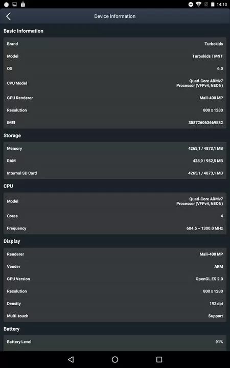 Как и предыдущие модели серии TurboKids, новинка не может похвастаться мощной аппаратной начинкой, но для поставленных задач производительности более чем хватает. Процессор тут - MTK MT8321, 4 ядра, работающих на частоте до 1300 МГц, работающий в паре с графическим ускорителем Mali-400MP. Объём оперативной памяти составляет 1 Гб, а встроенной памяти – 8 Гб, из которых пользователю доступно чуть более 4 Гб.