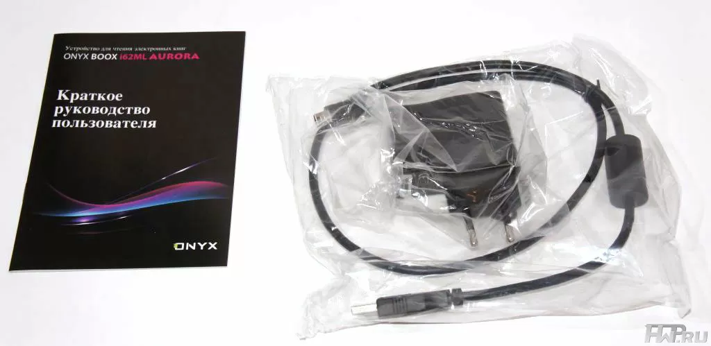 Вместе с книгой покупатель получает: чехол со съёмным ремешком, сетевое ЗУ с USB портом, miniUSB кабель и небольшую кипу бумаг (руководство пользователя и прочее).