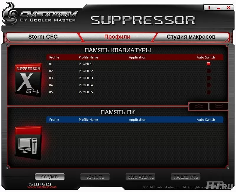 С помощью этой утилиты можно редактировать профили, хранить их на ПК и загружать в энергонезависимую память клавиатуры. На клавиатуре, соответственно, хранится до 5 профилей, на компьютере можно держать сколько угодно профилей, при необходимости загружая их в память устройства.
