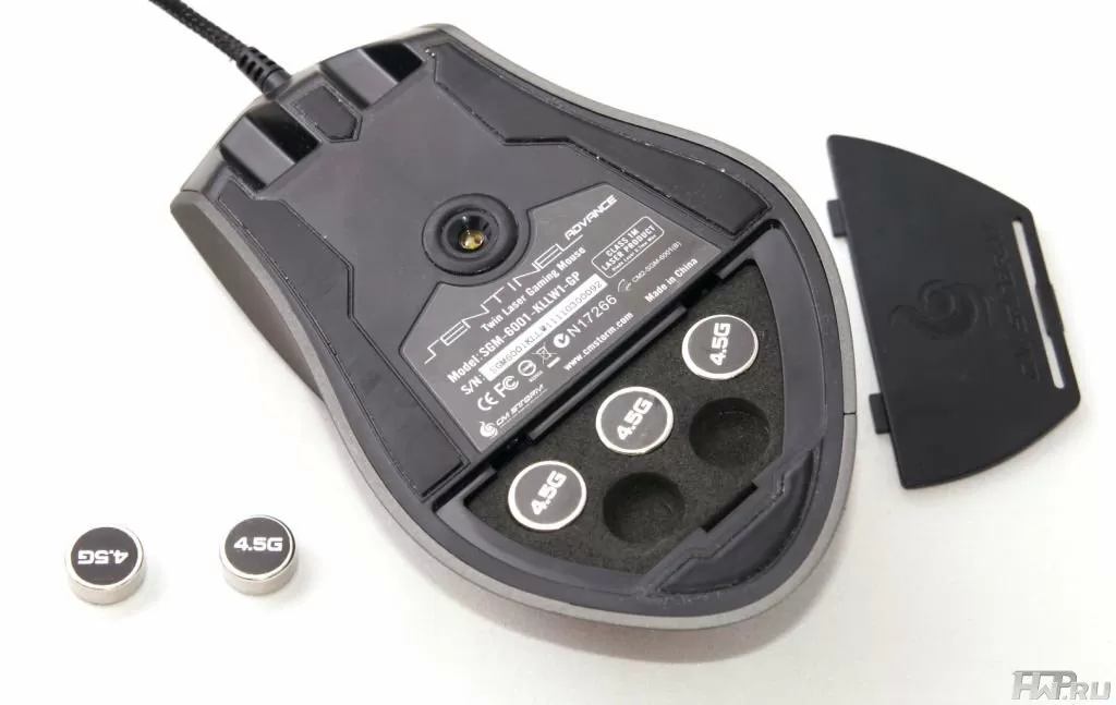 Сдвоенный лазер немного смещён вверх от середины манипулятора. А в нижней части располагается отсек с грузиками - пять штук по 4,5гр. С помощью них можно регулировать вес мышки от 139 до 161,5гр. Жаль, что грузики располагаются близко друг к другу, что исключает регулировку развесовки мышки. Хотя в этом плане вопросов нет, но наличие выбора всегда в плюс.