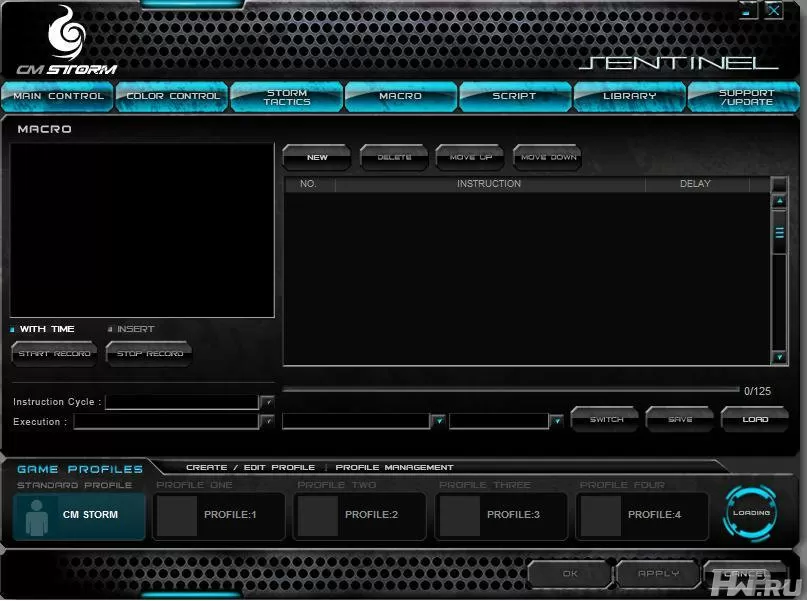 Чуть выше располагается одинокая программируемая кнопка. По умолчанию она настроена на переключение игровых профилей. В CM Storm Sentinel Z3RO-G установлена энергонезависимая память, хранящая в себе 5 игровых профилей. К сожалению, кнопка располагается в не самом удачном месте, нажимать на неё не очень удобно - приходится сильно тянуться пальцами. То есть придётся изловчиться, чтобы быстро нажимать её в активной игре.