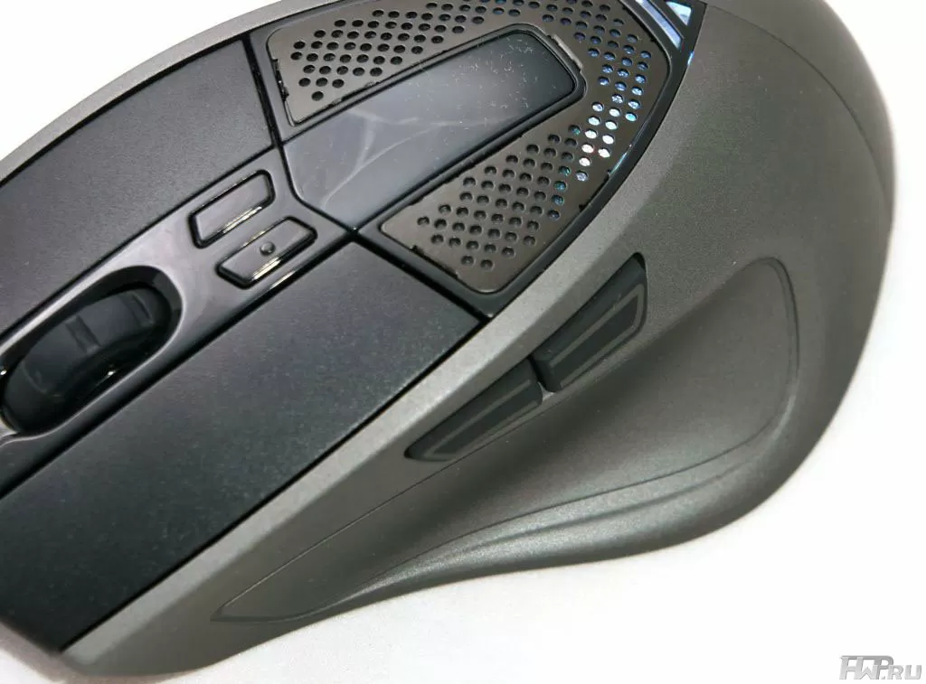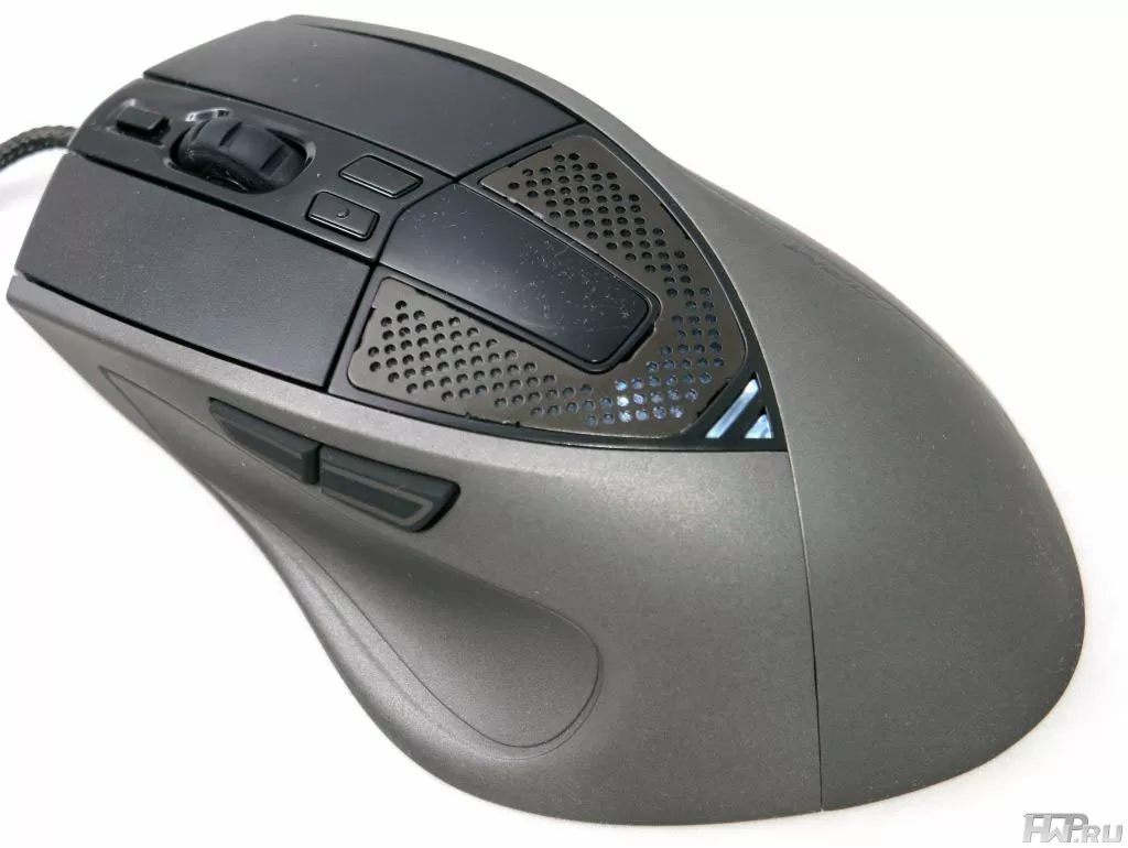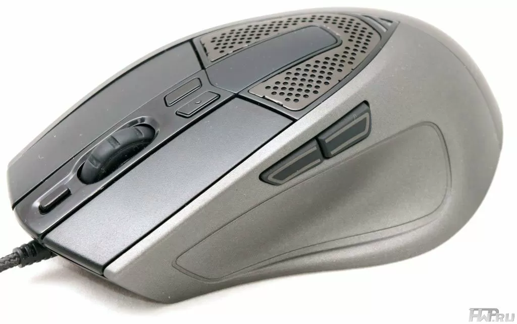 В правой части мышки ничего необычного нет. И левая и правая боковины выполнены из одного пластика тёмно-серого цвета. Чтобы придать контраст, верхняя часть с основными кнопками выполнены из чёрного пластика, а решёточка - металлическая!