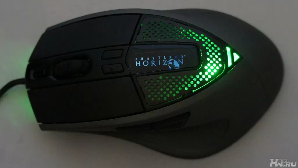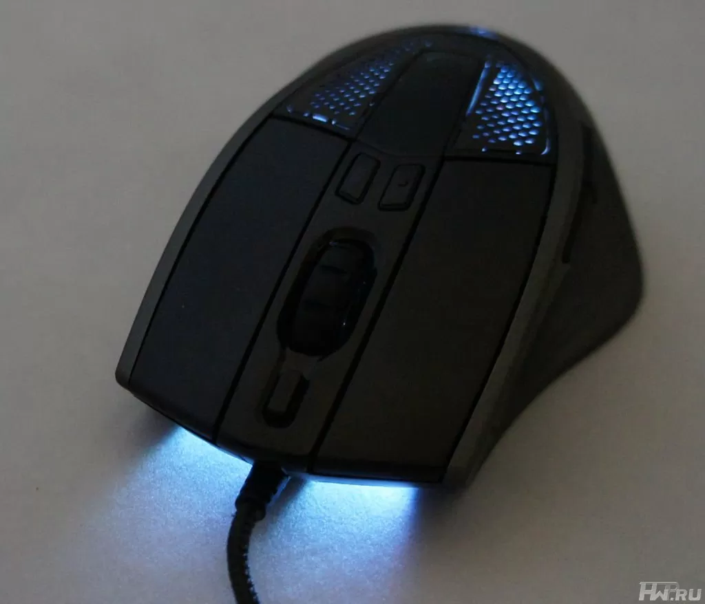 … в передней части мышки - подобие фар у автомобиля. Цвет подсветки меняется в зависимости от выбранного игрового профиля, также можно настроить моргание "фар" в такт выстрелам (т.е. нажатиям левой кнопки мыши). Настройки иллюминации достаточно гибкие, всё опять же зависит от вашей фантазии.