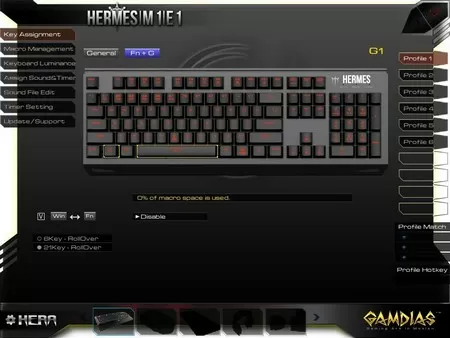 Так же к плюсам Hermes M1 я отнесу подсветку – да её цвет не меняется, но сочетание имеющихся цветов и их яркости меня, ярого не любителя лишних источников света, абсолютно не раздражает, а даже наоборот, как-то успокаивает. Ещё к плюсам – алюминиевая верхняя часть, поддержка макросов. Кстати, сначала для меня было шоком что между пробелом и левым Ctrl расположена не кнопка «Win», а функциональная клавиша («Fn», что с точки зрения геймера абсолютно правильный ход), но потом я опытным путём выяснил что её легко поменять местами с кнопкой «Win» что справа от пробела. А вот к спорным моментам я бы отнёс поддержку двух режимов – 6 или 21 key RollOver (количество одновременно нажимаемых клавиш). Конкуренты в основном предлагают полную поддержку Anti-Ghosting, то есть способны обрабатывать нажатие неограниченного количества клавиш. С другой стороны, куда уже больше 21 клавиши? Это даже двух рук не хватит.