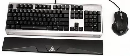 Связующим звеном я бы назвал съёмную пластмассовую поставку для рук, на которой изображен лейбл производителя, который есть также и на корпусе мышки. Кстати крепление подставки к клавиатуре по началу кажется слишком простым и хлипким, но нет, зацепы входят очень плотно, хотя некоторые сомнения касательно долговечности у нас всё же имеются.