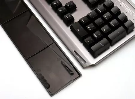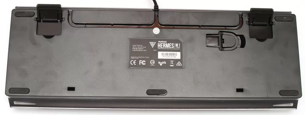 Снизу у клавиатуры мы видим два интересных момента. Первый – это посадочное место для комплектного ключа для съёма клавиш. Второй – это «туннель» для прокладки кабеля мышки. На мой взгляд, это очень удобная штука. Почему другие производители так не делают?