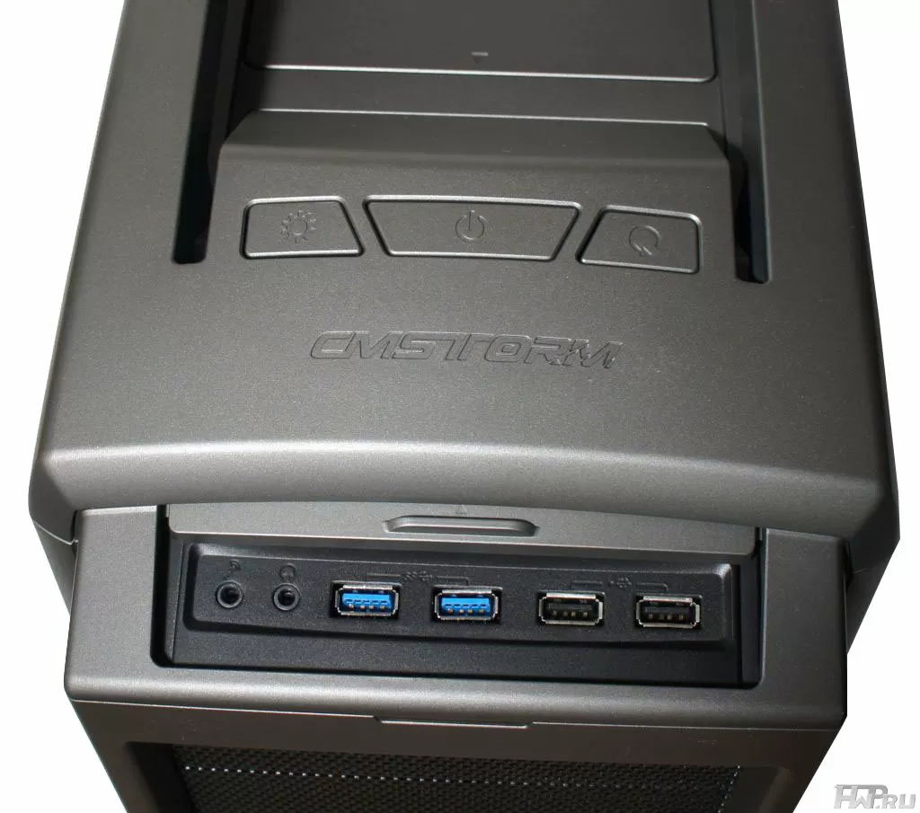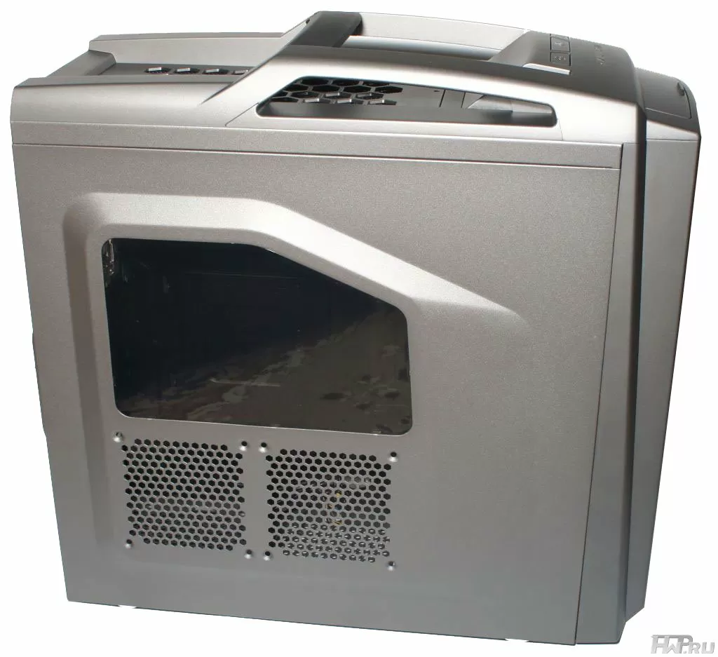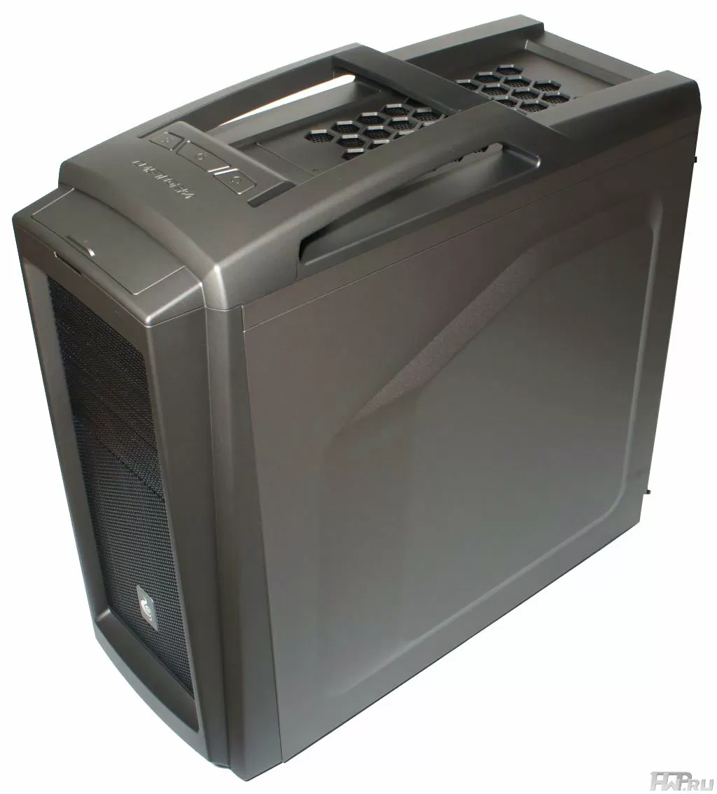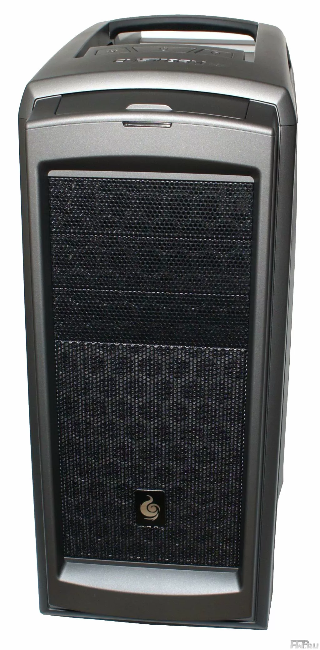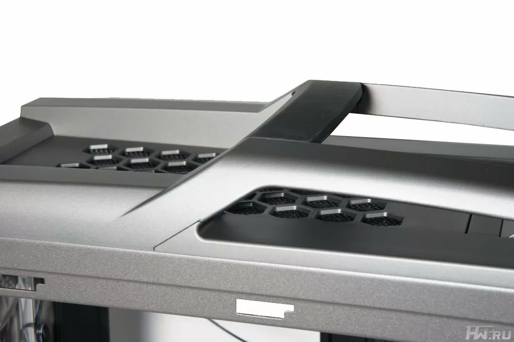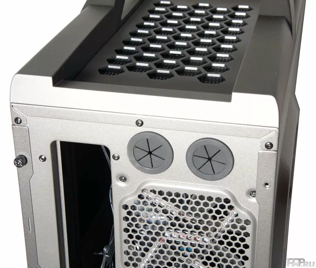 она монолитная и выполнена из тонкой металлической сетки. Никаких вам дверок - они повредят системе охлаждения, а если в доме есть маленькие дети - просто не подпускайте их к вашему компьютеру. За перфорацией прячутся два посадочных места для двух 120 мм вентиляторов (или одного 140 мм). Сверху же находятся три слота для 5,25 дюймовых устройств: один подойдет для какого-нибудь аналогового Reobus-а, второй - для контрольной панели аудио карты, а третий... ну разве что для Blu-Ray привода, чтоб не пустовал.