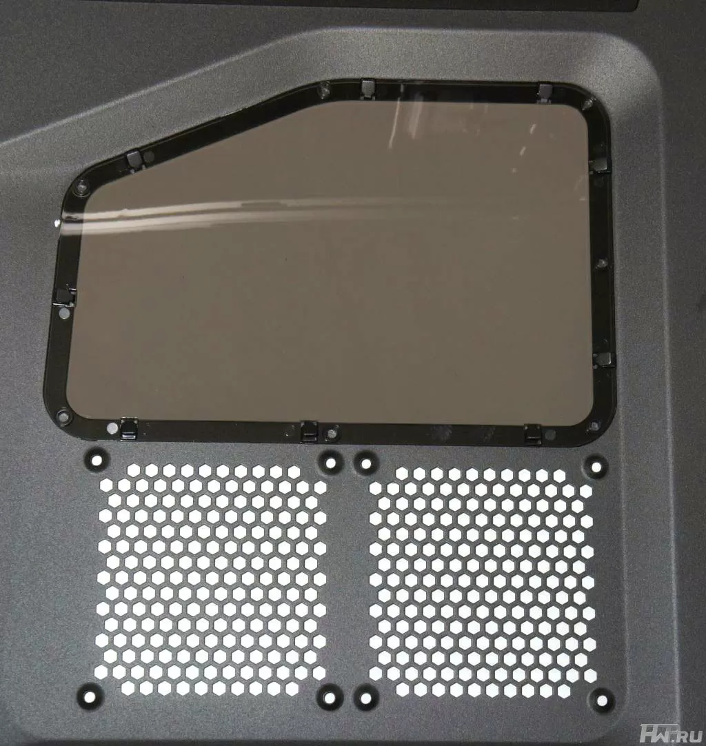 Левая боковая стенка имеет небольшое окошко, открывающее прекрасный вид на тщательно подобранные комплектующие будущего компьютера. Под ним - два места для вентиляторов размерами 120мм, что вполне позволяет охлаждать видеокарты уличным воздухом с минимальным шумом.