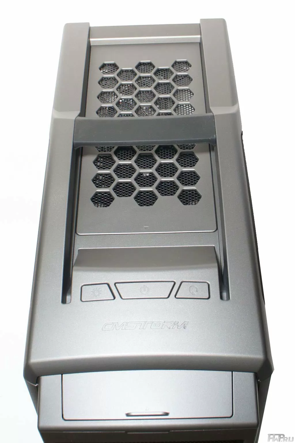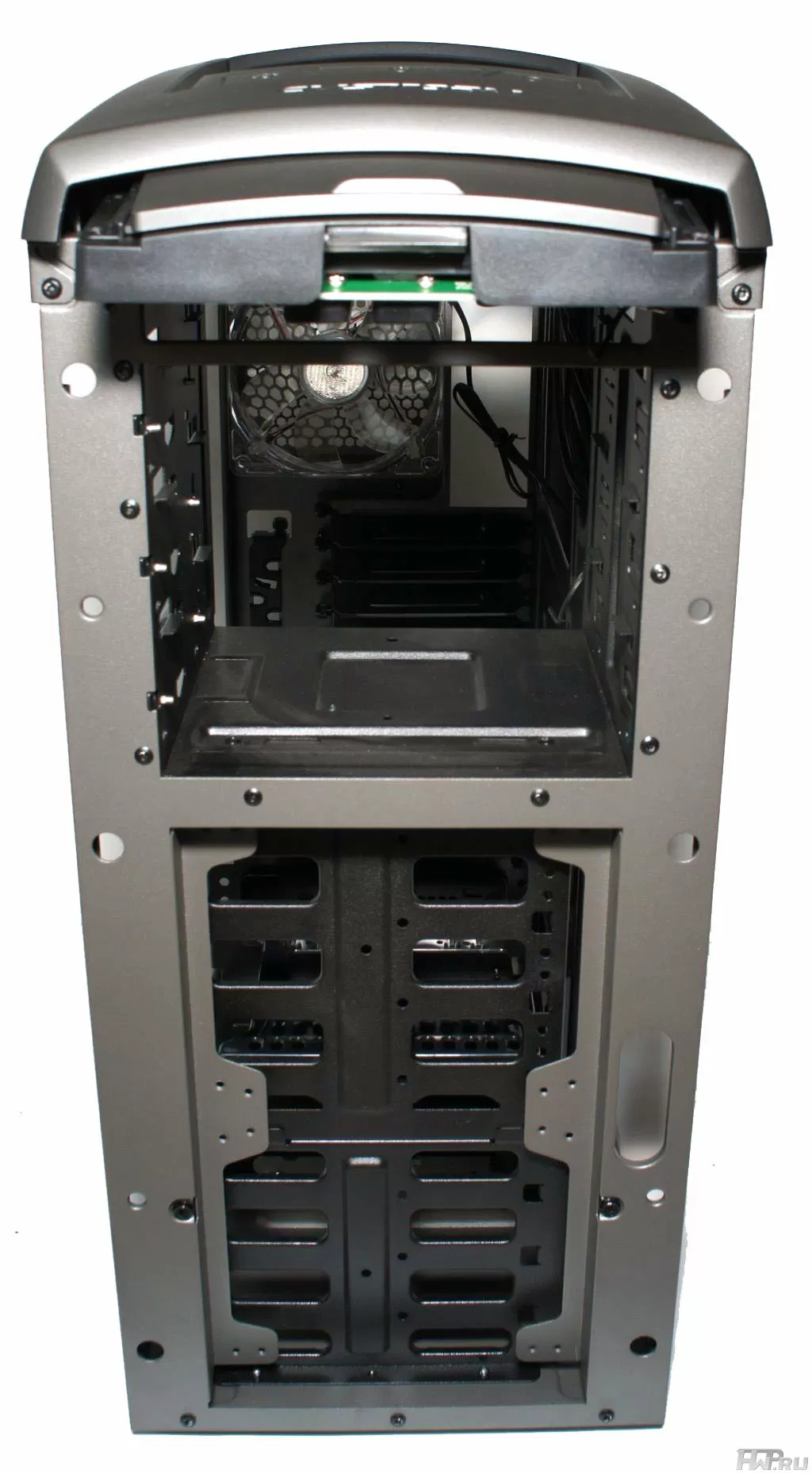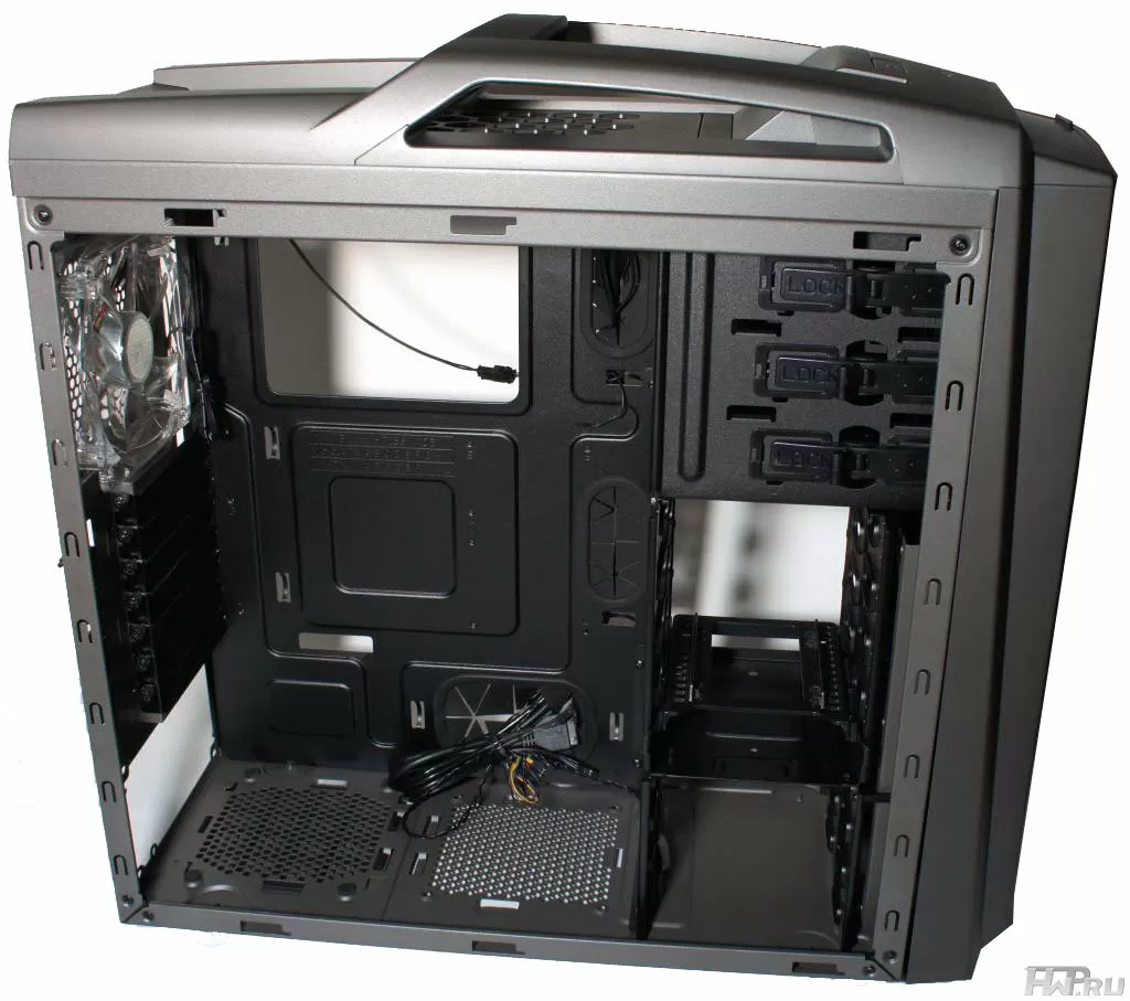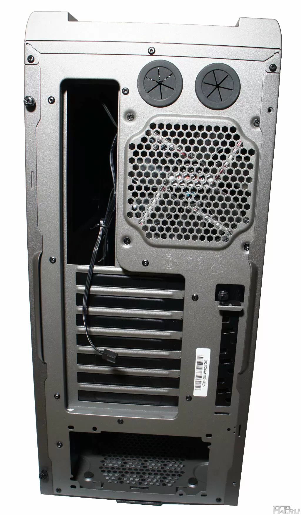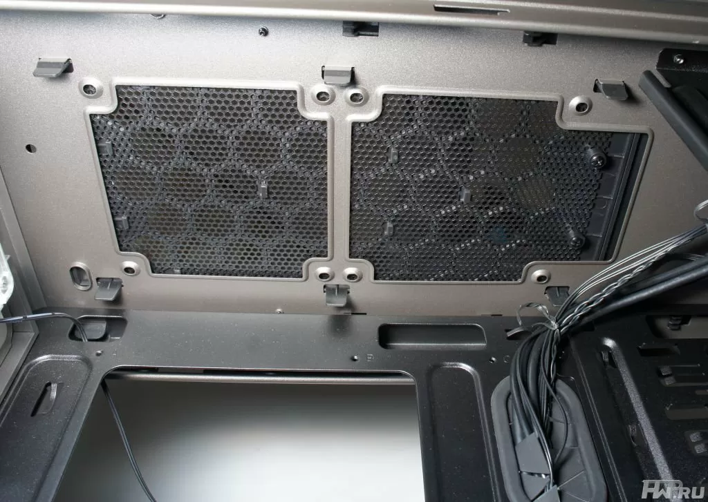 Сверху находится съёмная крышка, прикрывающая вентиляторы. Для её снятия достаточно отжать шесть ушек.