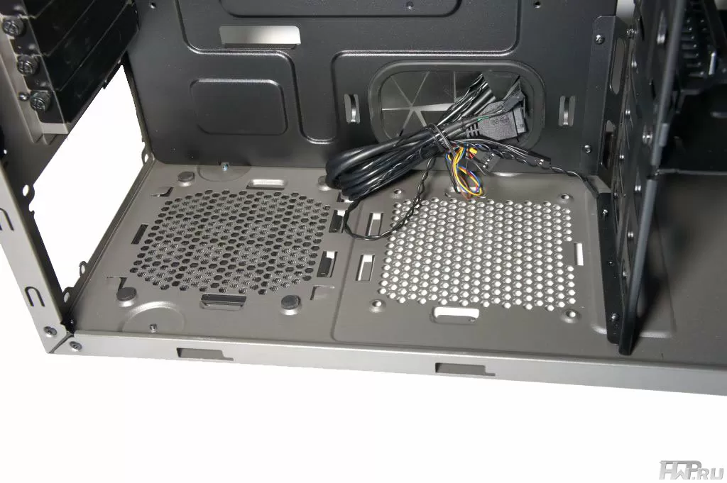 Правая боковая стенка пустая, но как и левая имеет выштамповку. В принципе, только на правой стенке она несёт практическую пользу - она даёт дополнительное место для укладки проводов. На левой же выштамповка присутствует скорее для симметрии.