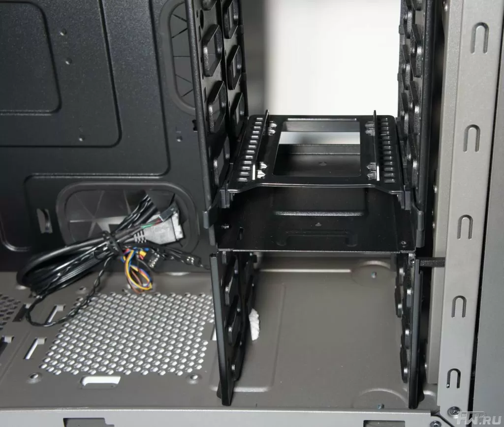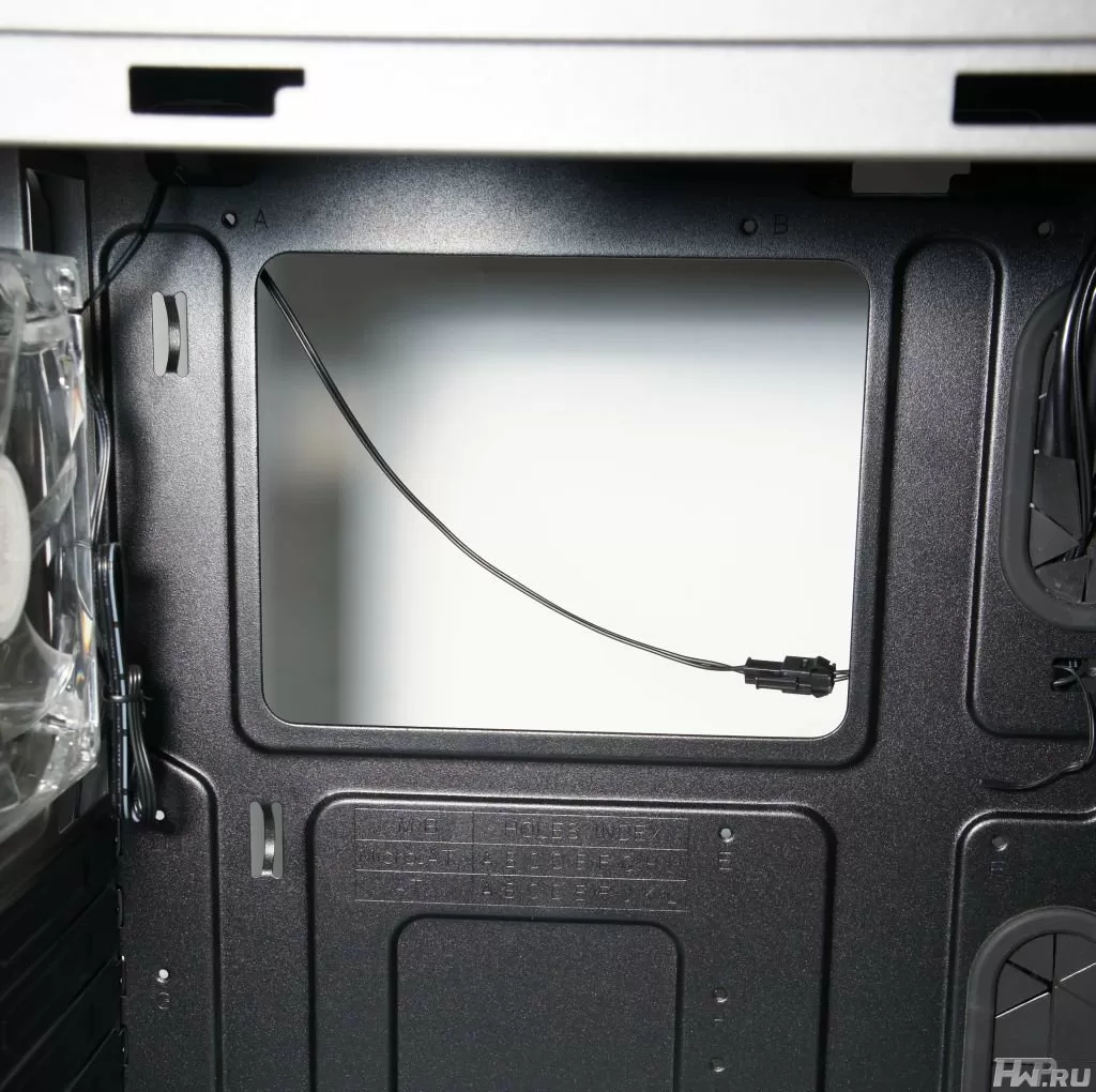 Аналогичные технологические отверстия можно увидеть справа от материнской платы. Через нижнее удобно прокладывать SATA кабели, а через верхнее, в зависимости от материнской платы, можно прокинуть кабель питания. По умолчанию через верхнее отверстие уже проложены штатные кабели корпуса (к USB портам и кнопкам).