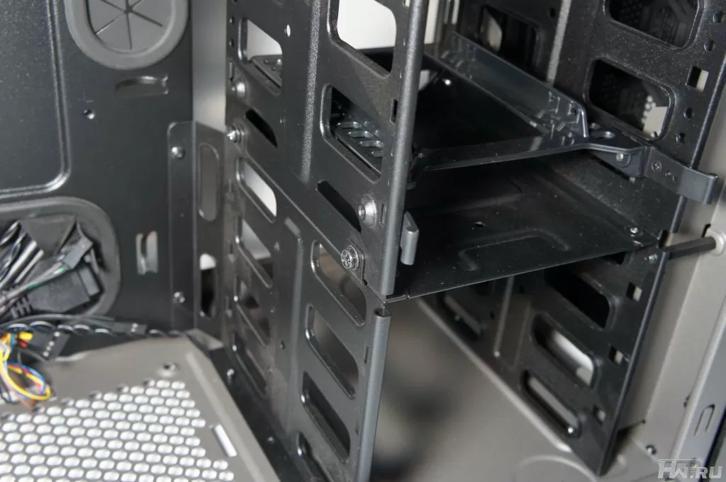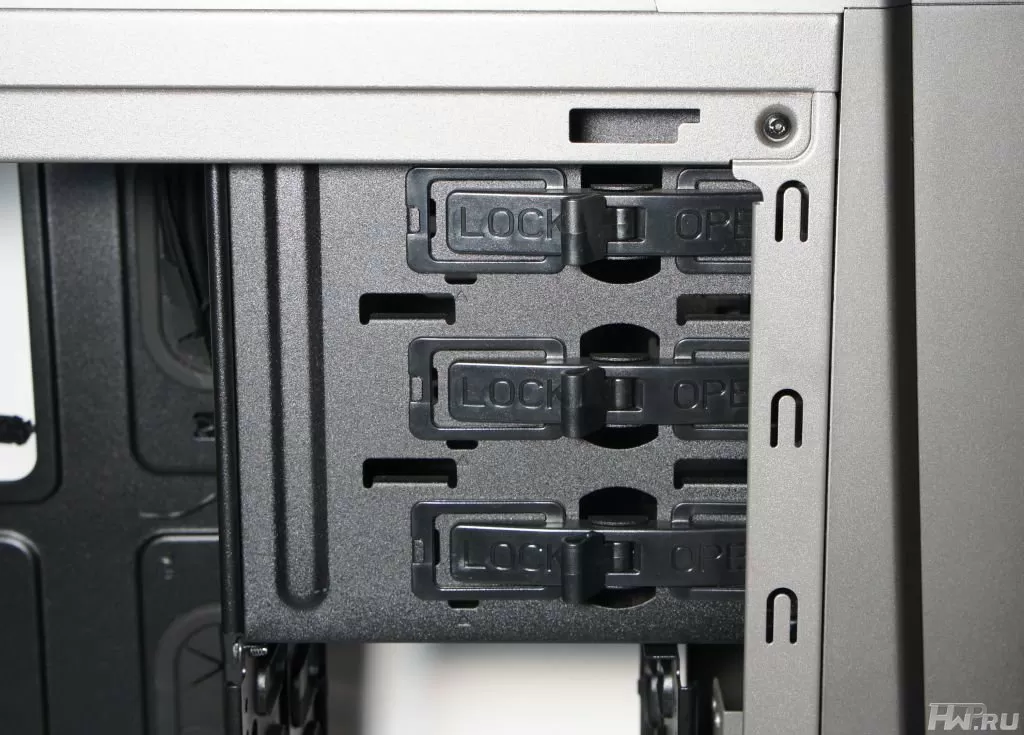 Отсеки для оптических приводов оснащены механизмом для безотвёрточной установки. Если доверия к пластику нет, то механизмы легко демонтируются и можно прикручивать устройства обычными болтами. Что особенно удобно в случае установки, например, реобаса.