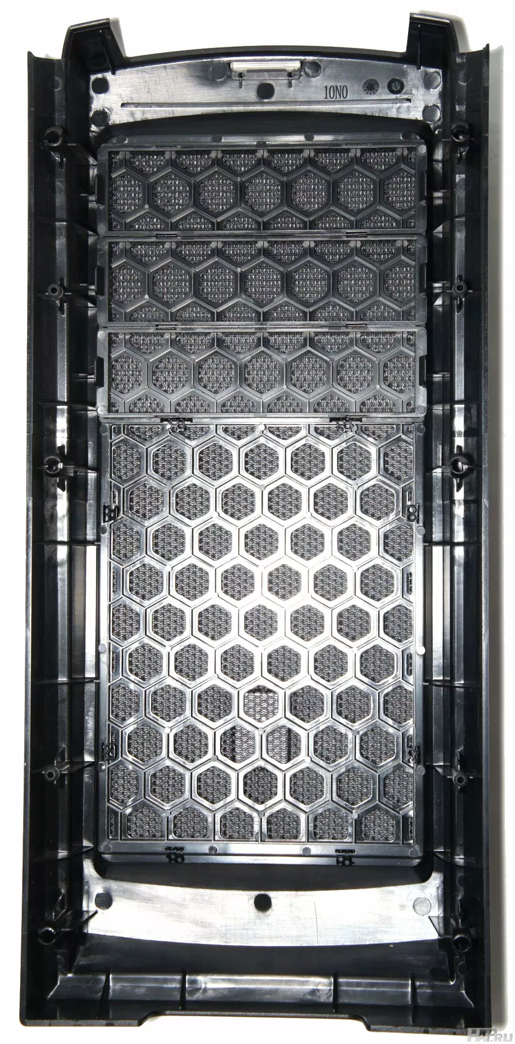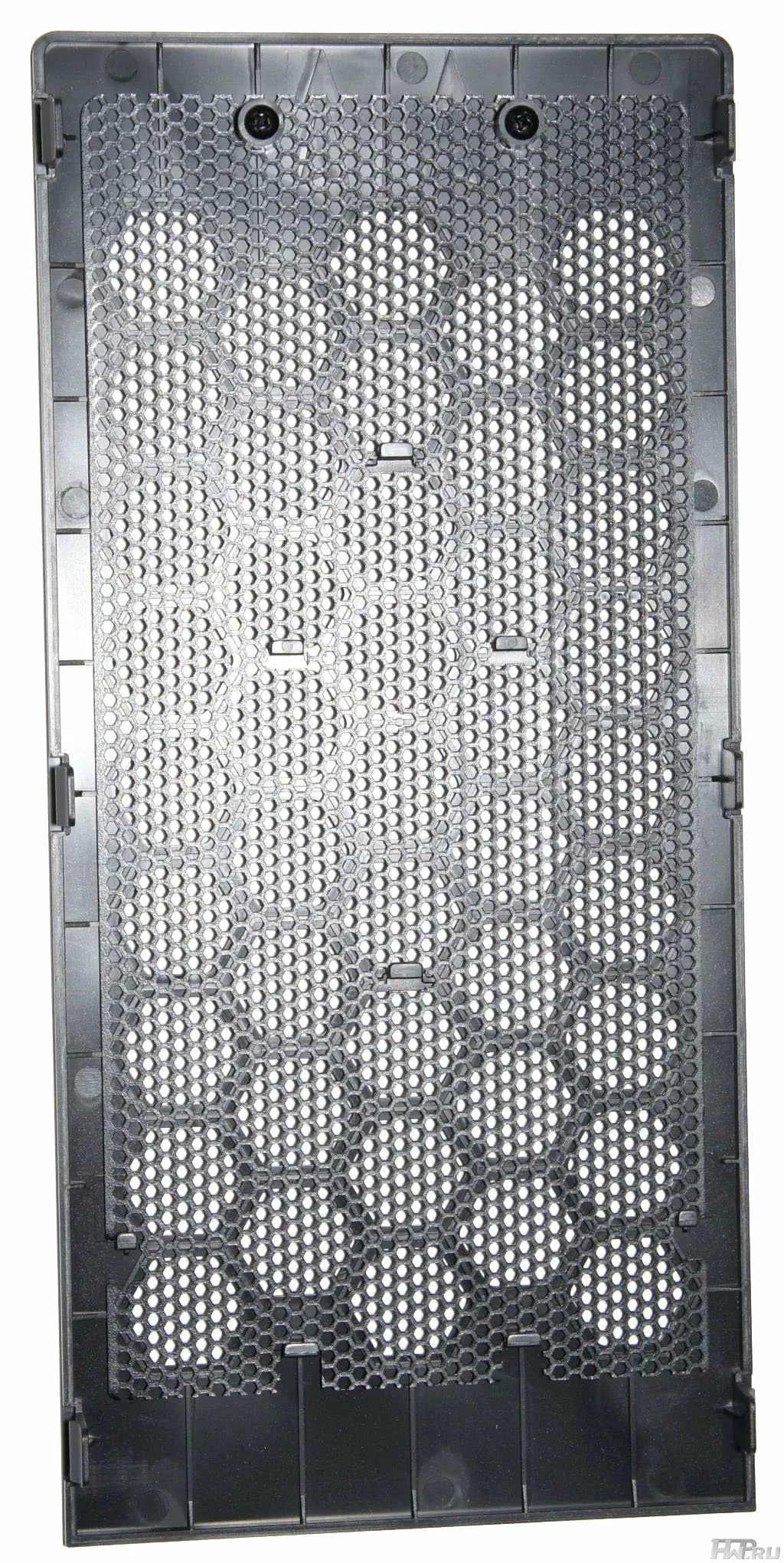 Передняя панель Cooler Master Scout 2, как и у многих других корпусов, снимается непросто. Пластмассовые крепления достаточно тугие, и по закону подлости самые тугие находятся в самых неудобных местах - сверху. Опять та же ячеистая сетка для лёгкого прохождения воздуха, и опять же как таковой отсутствующий фильтр (мелкую сетку в один слой, аналогичная упоминаемой выше, сложно считать полноценным фильтром). Хотя тут он был бы особенно уместен, ведь забор основной массы воздуха должен осуществляться именно спереди. Не помешало бы защитить фронтальные вентиляторы как минимум индивидуальными фильтрами. А в идеале - сделать цельный фильтр на лицевой панели. На её нижней половине, что под заглушками для оптических устройств. Однозначно придётся дорабатывать самостоятельно.