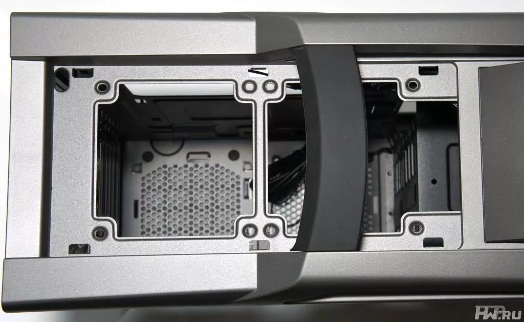 Под ручкой находится съёмная панель, за которой скрываются ещё два посадочных места для вентиляторов. Даже если вы никогда не собираетесь вывозить свой компьютер за пределы дома, готов поспорить, что с такой ручкой на корпусе вы будете пылесосить под ним гораздо чаще! Тем более, что делать это надо обязательно, так как блок питания расположен снизу.