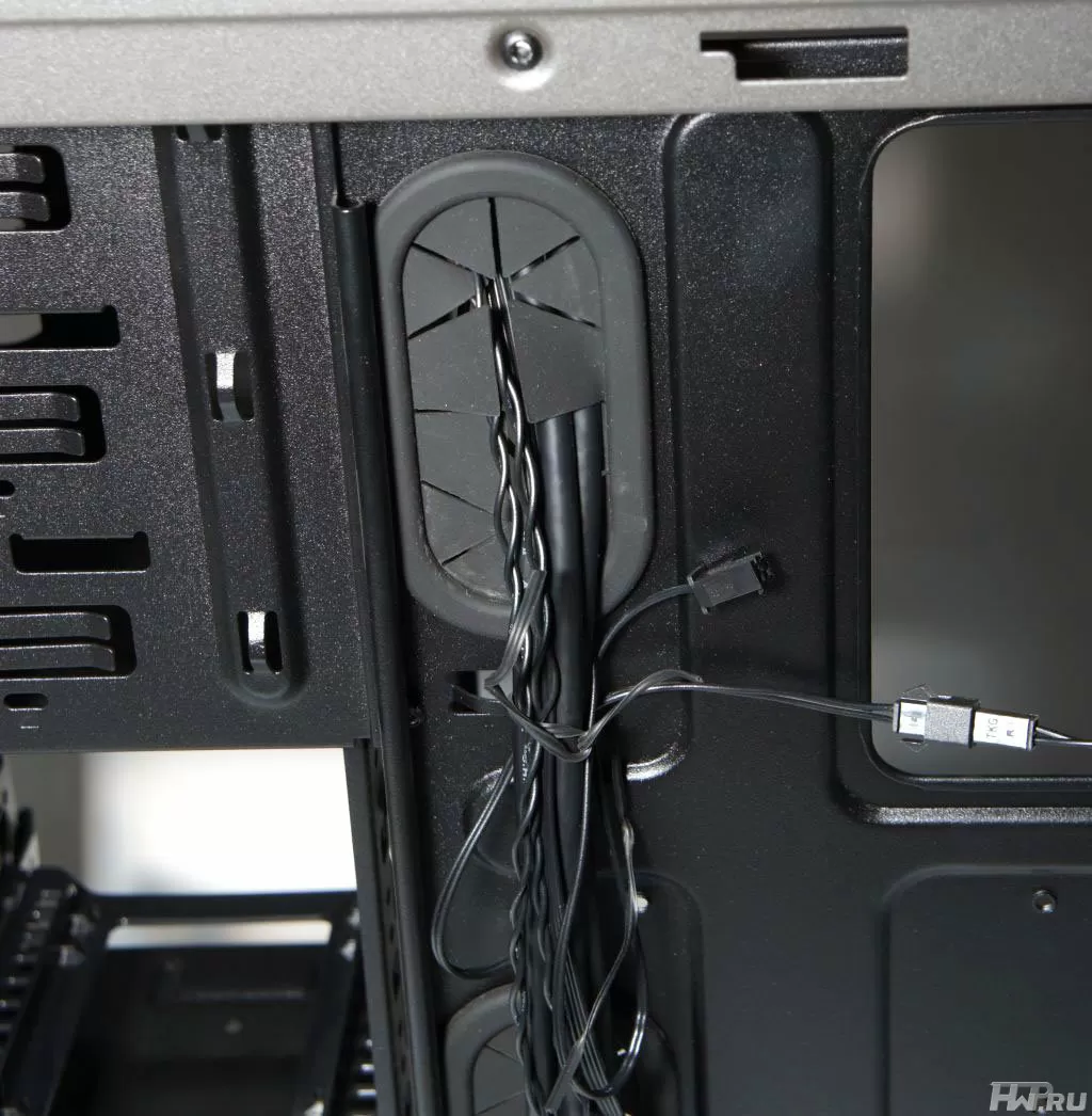 На этой же фотографии можно увидеть отверстие с резиновой шторкой для укладки проводов. Оно очень большое, что позволяет без труда просовывать разъём для питания материнской платы 24+4pin. Через это же отверстие удобно прокладывать кабели для подключения к портам у нижнего края материнской платы, например USB с фронтальной панели корпуса.