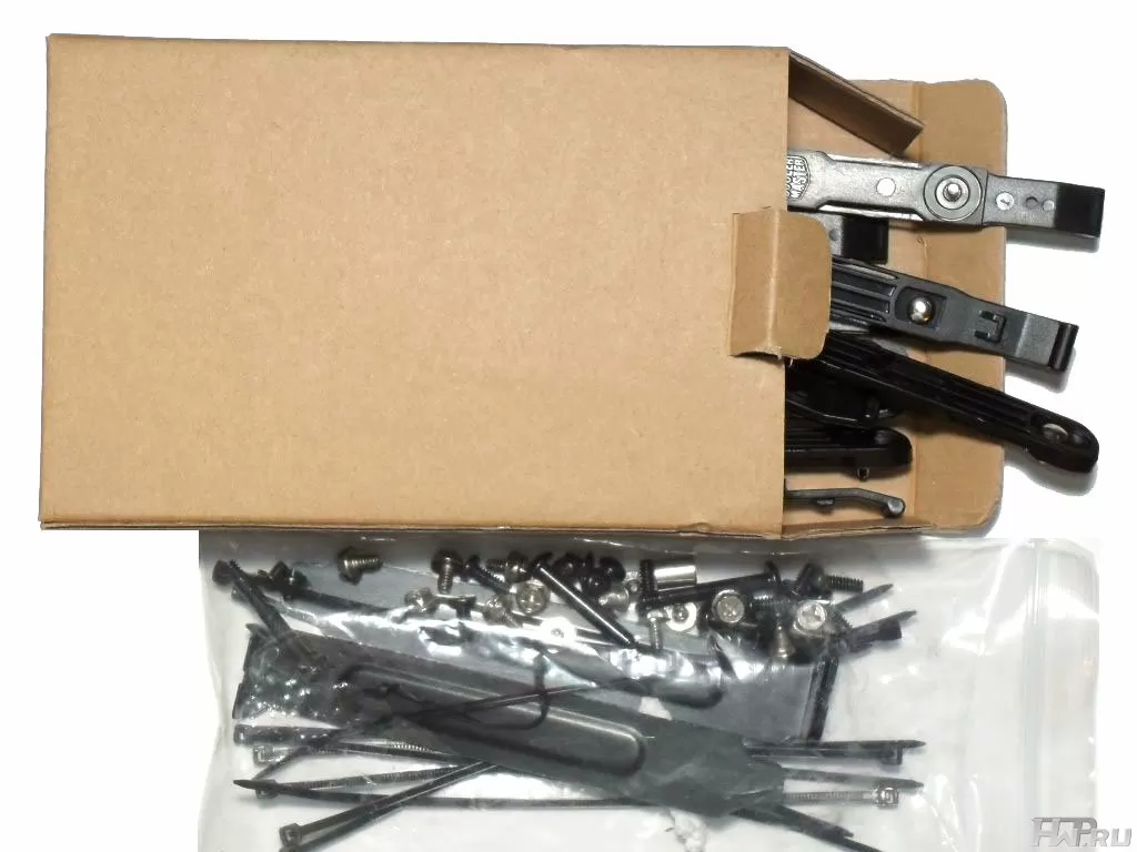 Коробочка с комплектующими включает в себя: внешний спикер, комплект салазок для жестких дисков, стойки для материнской платы, набор черных болтов для крепления материнской платы и накопителей, длинные болты для крепления фронтальных, а также нейлоновые стяжки того же черного цвета. Имеется даже бита для удобного закручивания стоек с помощью крестовой отвёртки. Всё что нужно - всё в комплекте, большего и не требуется.