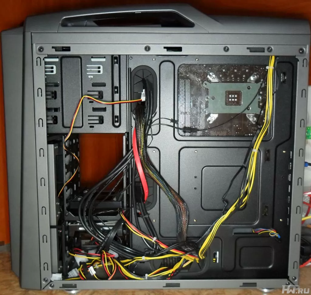 Вид с обратной стороны тоже вполне себе красивый. Очень много свободного места даже после укладки проводов. Излишки проводов и свободные "хвосты" можно или просто закинуть в отсеки для жестких дисков, или аккуратно расположить за материнской платой. На поддоне материнской платы имеются несколько специальных ушек-выемок, к которым можно прикрепить провода с помощью стяжек. Легко установить дополнительные накопители или дополнительные вентиляторы уже после того, как вся система собрана. Отличный доступ к задней части материнской платы в области процессора. В CM Storm Scout 2 легко поменять и блок питания, и даже материнскую плату. В таком просторе это делается очень просто и без лишних хлопот.