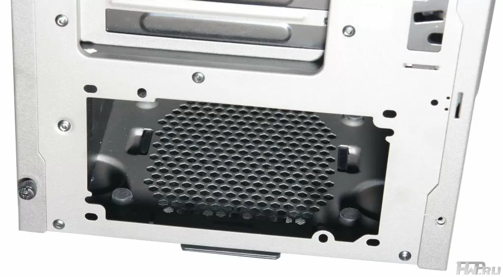 Чуть правее от блока питания, мы видим одно посадочное место для вентилятора. Что удивительно, так это отсутствие на нём фильтра. Видимо, производитель предполагает, что он потребуется лишь в одном месте из двух - или под БП или для рядом стоящего вентилятора, но никак не одновременно. Очень удобно, что корпус не ограничивает вас в глубине используемого блока питания. Хотите модель увеличенного размера? Да пожалуйста!