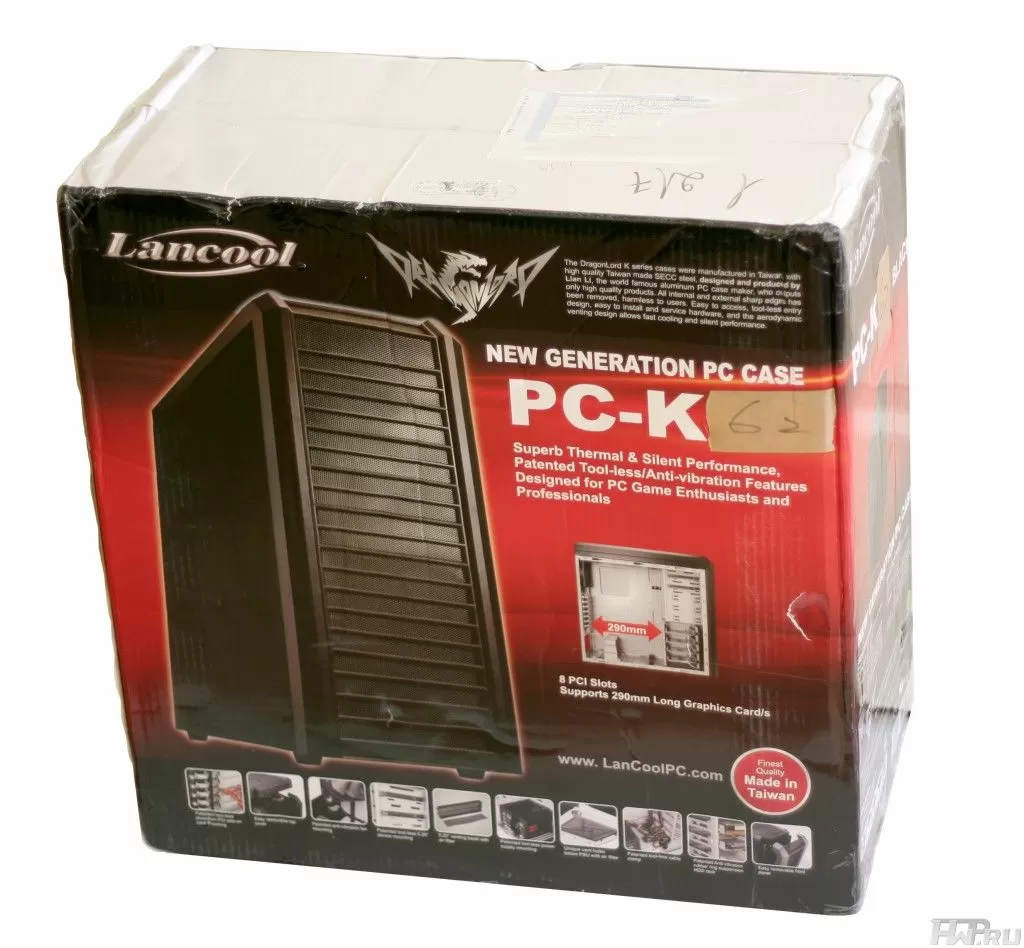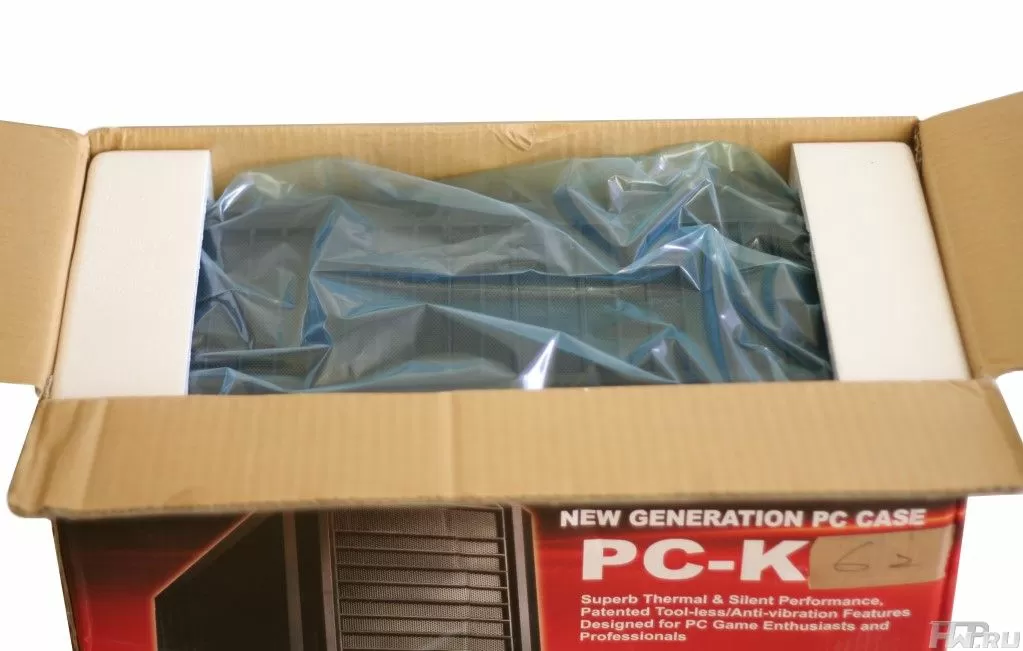 Коробка имеет неброский красно-черный дизайн, на лицевой части которого красуется фронтальная часть PC-K62. На домашней странице Lancool, как и на самой коробке, о весе почему-то ничего не сказано, но исходя из почтовой декларации cледует, что вся упаковка весит около 13 килограмм из чего мы делаем вывод, что сам корпус весит как минимум за 10. PC-K62 упакован в полиэтиленовый пакет и закреплен в пенопластовые стойки, чего вполне достаточно для безопасной транспортировки.