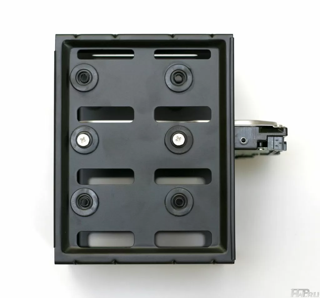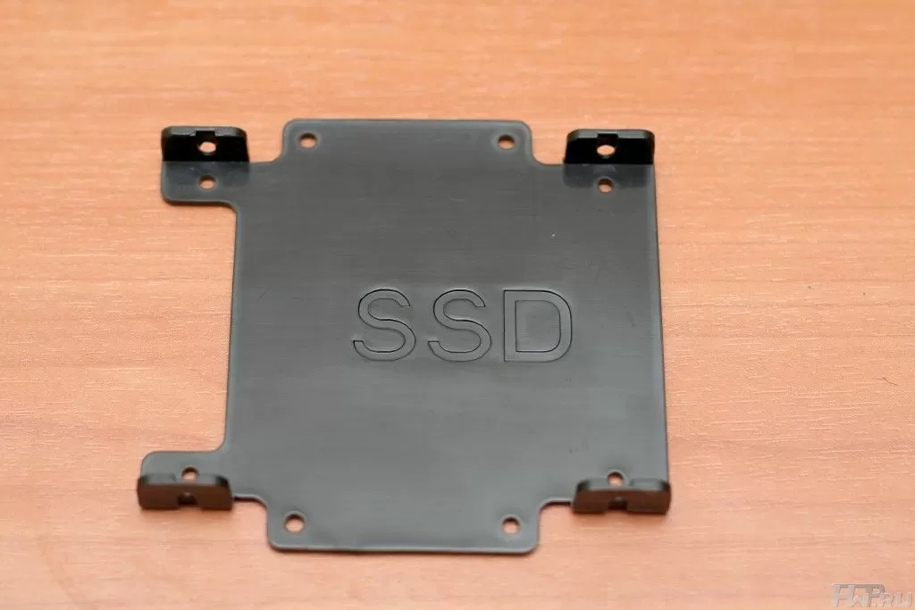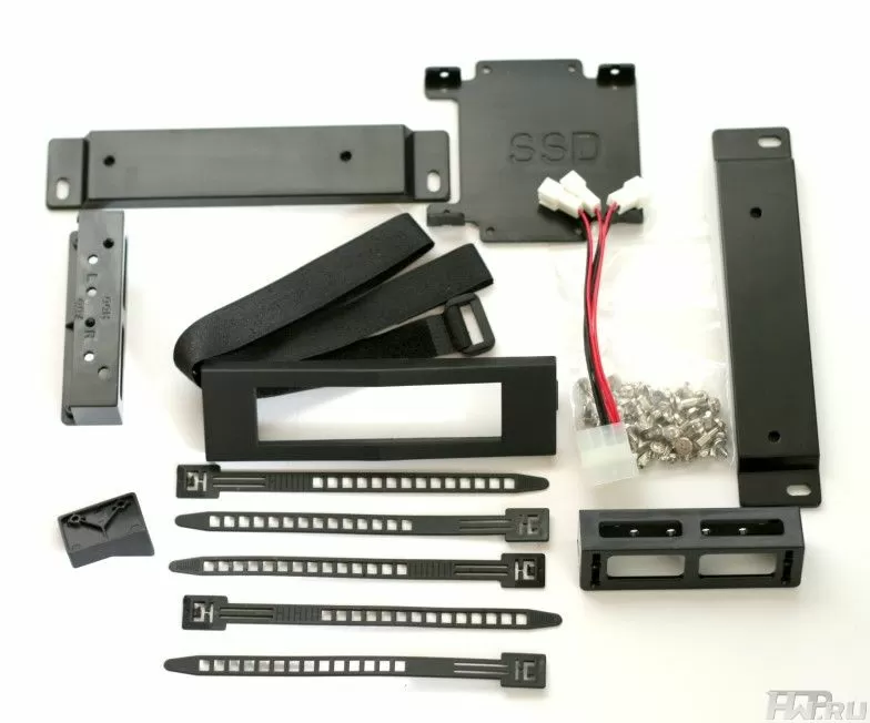 При помощи SSD скобы можно установить 2.5" жесткий диск или же сам SSD. Устройство крепится в скобу четырьмя шурупами и затем четырьмя другими шурупами привинчивается к задней части корпуса, а точнее к правой части 5.25” стойки оптических дисков.