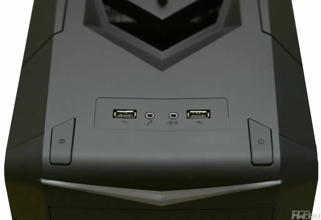Кнопки управления находятся в передней части корпуса по его бокам, а функциональные разъемы, в число которых входит два USB 2.0 и два обычных аудио разъема, посередине.