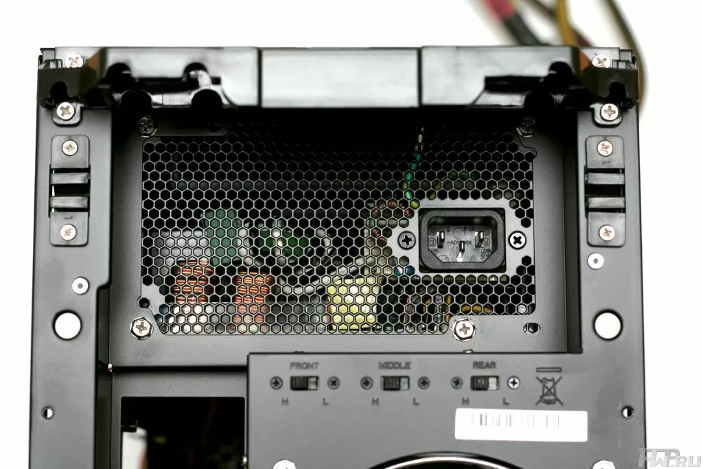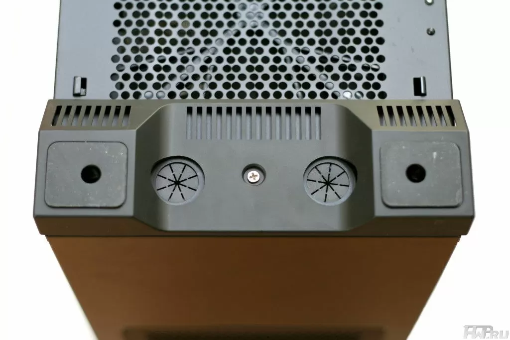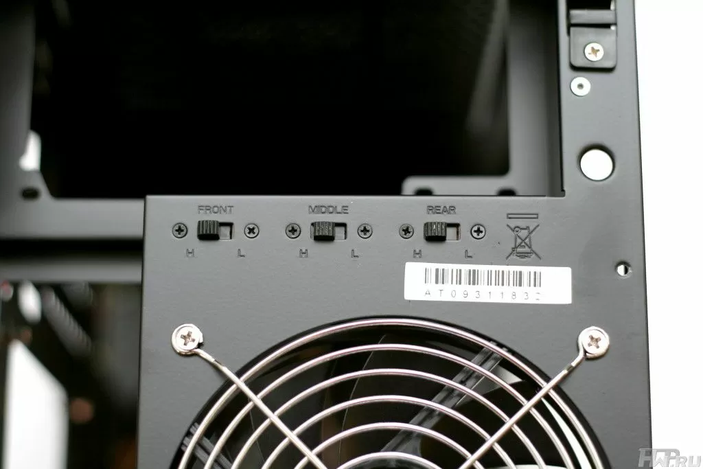 Скорость работы всех трех нижних 180 мм вентиляторов можно регулировать по отдельности друг от друга переключателем, находящимся в верхней части корпуса. В тихом режиме вентиляторы работают на 700 об/мин и создают уровень шума равный 18 дБА, а в производительном - скорость ровна 1000 об/мин и 27 дБА. К сожалению, постоянную скорость системного вентилятора (950 об/мин) изменить переключателем нельзя. Возможность переключить его на более низкие обороты, пришлась бы кстати, так как в тихом режиме он выходит на первый план, хоть и имеет самый низкий заявленный уровень шума в 18 дБА.