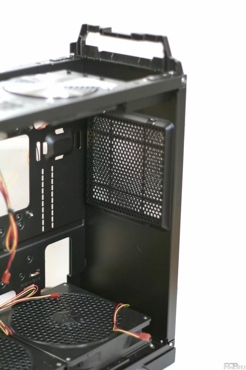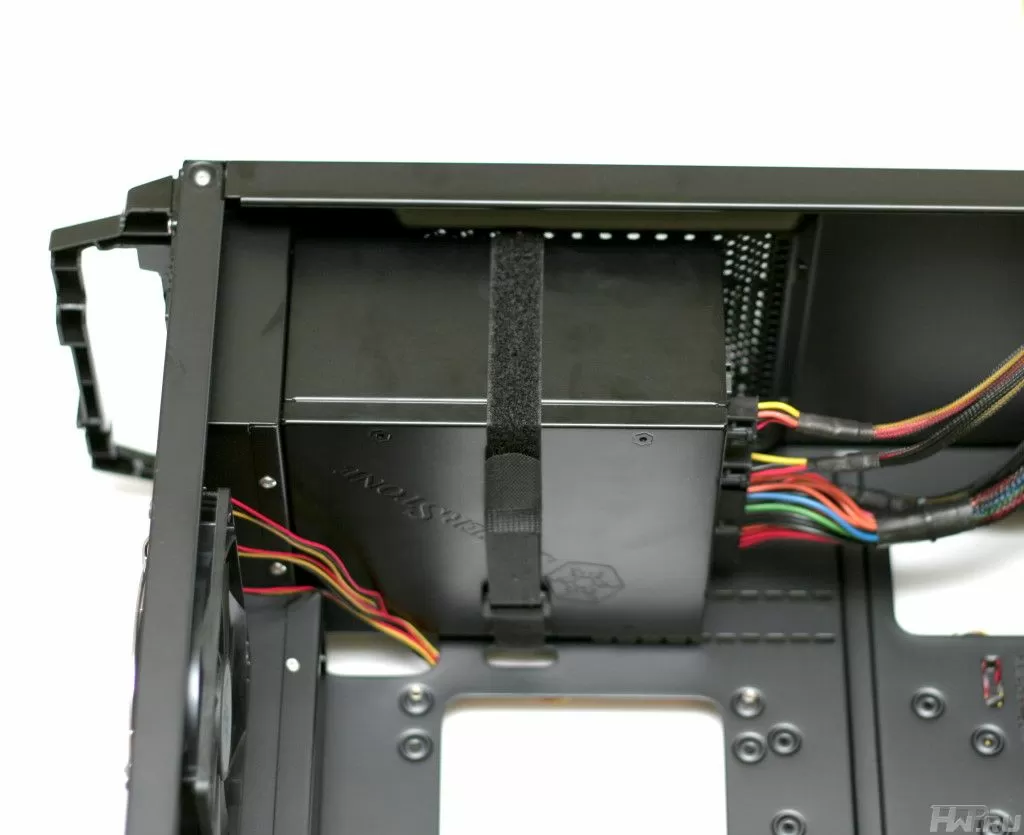 В правой задней части расположено место для блока питания. Он устанавливается достаточно интересно и, по возможности, пользователю при это не помешала бы дополнительная пара рук, так как блок крепится на весу и его нужно одновременно придерживать и закреплять шурупами. В комплект поставки входит специальный ремешок, который опоясывает блок питания и скрепляет его с корпусом, но никакой особой нужды в его использовании нет, так как кроме прижима, никакой роли он не выполняет и блок питания встает вполне ровно и без его использования. Так же есть возможность установить держатель блока питания находящийся в комплекте, прикрепив его к корпусу шурупом.