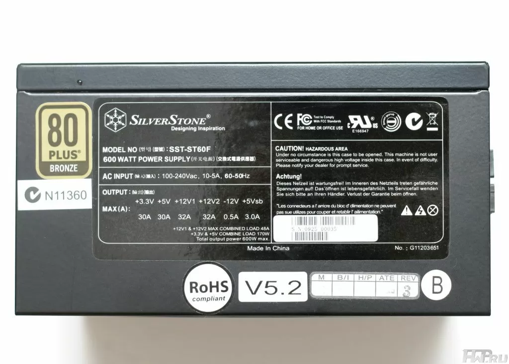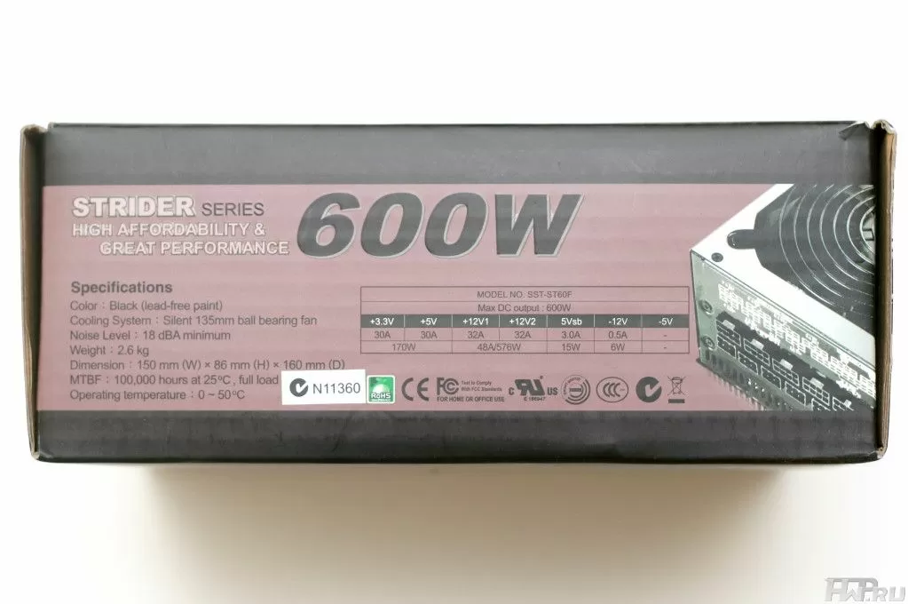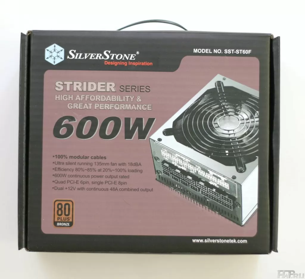 В руки к нам попал блок питания ST60F с мощностью равной 600 Вт. Упаковка имеет удобную ручку для переноски и на лицевой части находится достаточно информации, чтобы знать главные достоинства продукта. Изображение ST60F на упаковке в первую очередь говорит нам о том, что мы имеем дело с полностью модульным блоком питания и это естественно сразу относим к плюсам этого продукта. Специальная наклейка бронзово-черного цвета с логотипом "80PLUS Bronze" означает работу блока питания с КПД не менее 80% при нагрузке в диапазоне 20% - 100% от заявленного номинала. И третий, достаточно веский плюс, который упоминается на упаковке, это четыре 6-контактных разъёма питания PCI Express для современных видеокарт. Первое впечатление о ST60F создается совершенное иное, нежели то, которое обычно складывается при рассмотрении массовых продуктов начального или среднего класса. Хочется верить, что по ходу знакомства оно нас не покинет.
