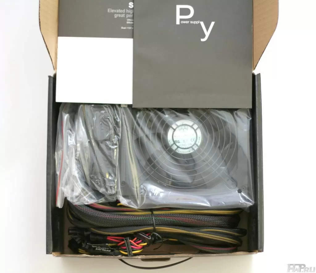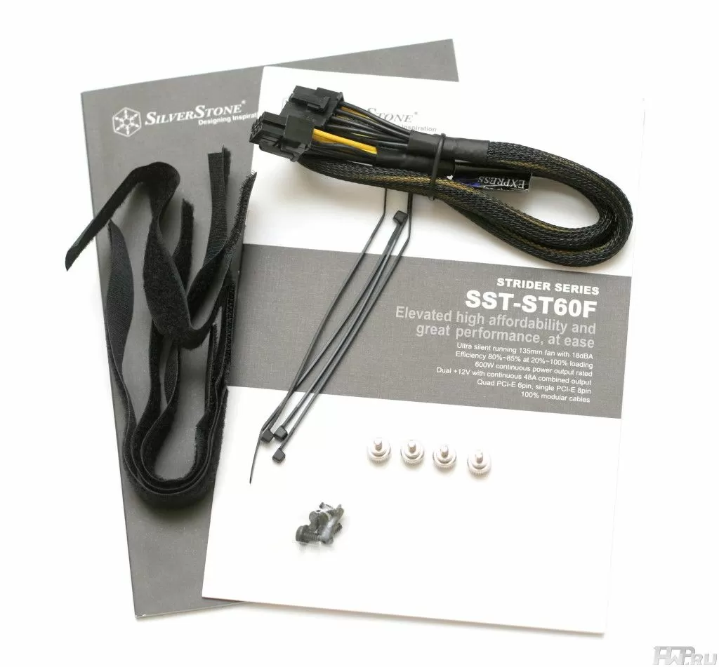 В коробке, кроме самого ST60F с уже установленными кабелями ATX 24-Pin, находилась инструкция пользователя на десяти языках включая русский. Для крепления блока питания в аксессуарах находится два вида винтов, с увеличенной рифленой головкой для удобного крепления руками и черные, крепление которых можно осуществить уже только отверткой. Так же к аксессуарам приложен кабель с 8-контактным разъёмом для подключения видеокарты.