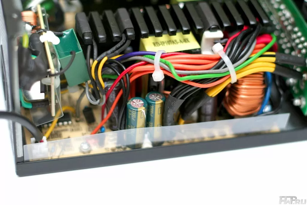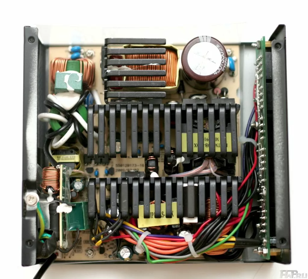 Открыв крышку блока питания мы видим, что монтаж компонентов выполнен аккуратно и присутствует надёжная изоляция критичных мест. В левой нижней части можно увидеть наличие EMI фильтра предназначенного для подавления высокочастотного шума, возникающего в процессе работы. Внутри ST60F установлены три черных радиатора, которые призваны уводить тепло создаваемое силовыми компонентами блока питания.