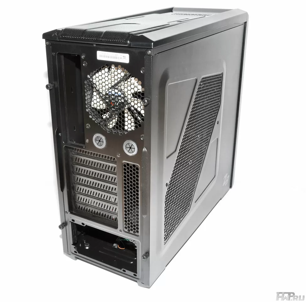 Перед нами тыльная часть корпуса Zalman Z9. За вентиляционными отверстиями виден предустановленный 120-мм вентилятор, под ним Zalman предусмотрительно расположила два отверстия, закрытые резиновыми колечками – как нетрудно догадаться, они послужат для трубок СВО. Также здесь можно отметить 7 посадочных мест для карт PCI и пустующее отверстие для монтажа блока питания, который предполагается размещать на дне корпуса.