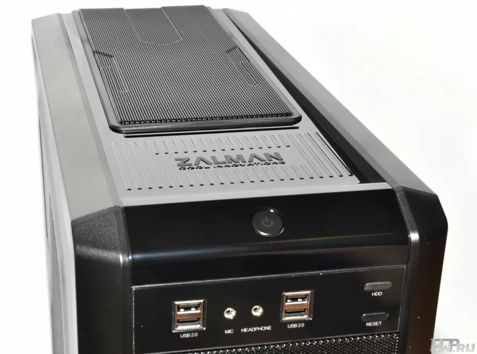 А теперь взглянем на верхушку корпуса, на которой первым в глаза бросается логотип Zalman, встроенный в небольшой поддон, на который можно класть всякие мелочи вроде ключей, мобильного телефона и тому подобного. На фотографии также можно разглядеть сетку, под которой предусмотрено два посадочных места под 120 или 140 миллиметровые вентиляторы. Что интересно, «монтажные площадки» для вентиляторов разборные – их можно снять и почистить.