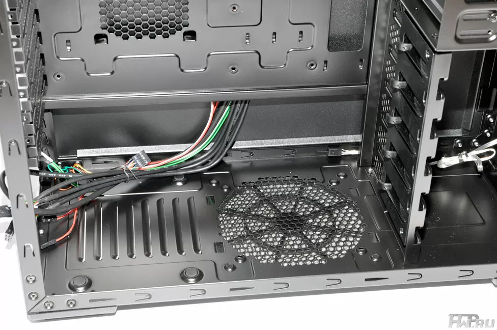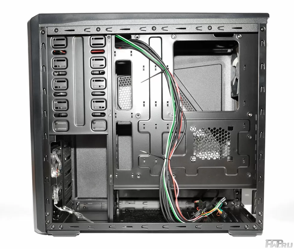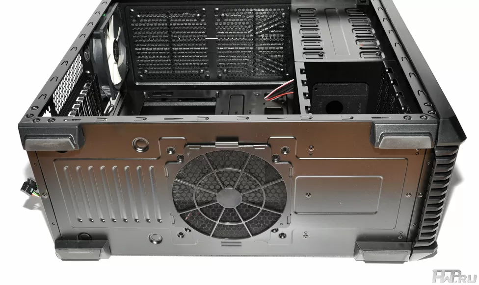 Это – противоположная часть корпуса, на которой виден оборот лотка для материнской платы. Провода, свисающие с отверстия в лотке, идут от кнопок, индикаторов, гнезд и прочих портов лицевой панели. Все как обычно – на концах проводов имеются соответствующие коннекторы, которыми они подключаются к материнской плате. Дизайн предусматривает проведение всех проводов под правой крышкой корпуса, таким образом, чтобы они не забивали пустое пространство в центральной части, не мешали охлаждению компонентов и не портили внешний вид.