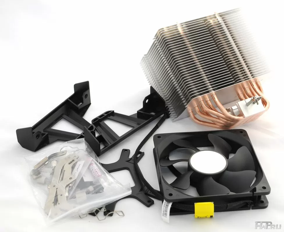 Кулер поставляется в большой картонной коробке в разобранном виде. В комплекте к нему идет один вентилятор, крепление на второй вентилятор и комплект креплений на процессоры Intel и AMD.