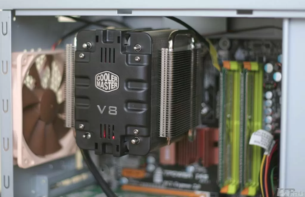 Cooler Master V8 был установлен в корпусе таким образом, чтобы горячий воздух выводился им к системному вентилятору, и дальше - за пределы корпуса.