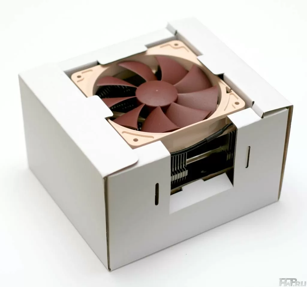Внутри коробки кулер с вентилятором закреплены в специальные защитные картонные вставки, только на этот раз отсутствовала защита на самой подошве кулера.
